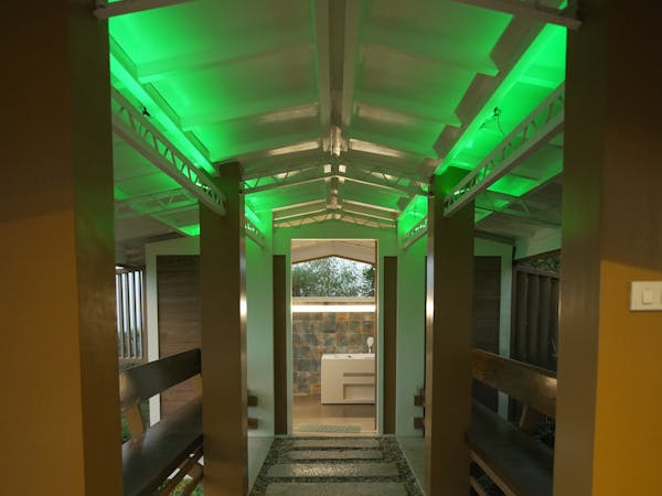 - a Bridgeway that leads to a seperate room, the "Cabana" that doubles as a second bathroom;