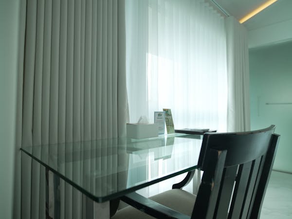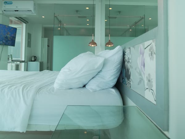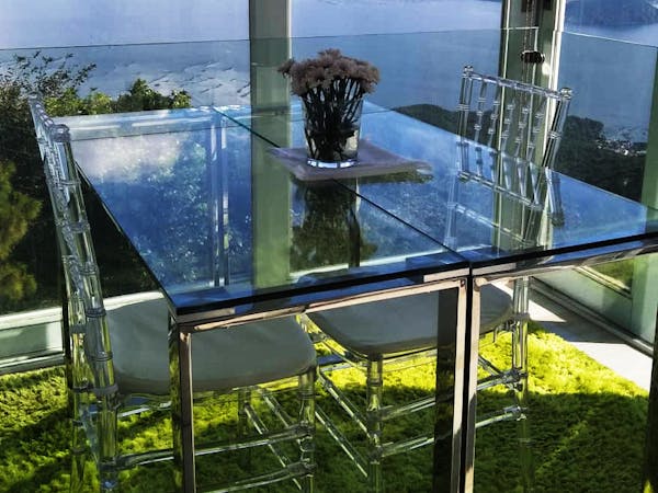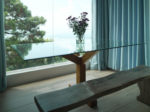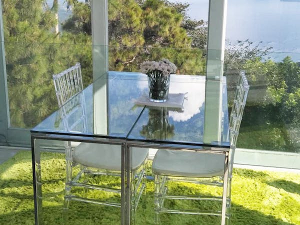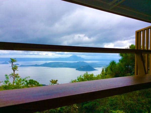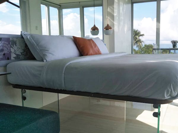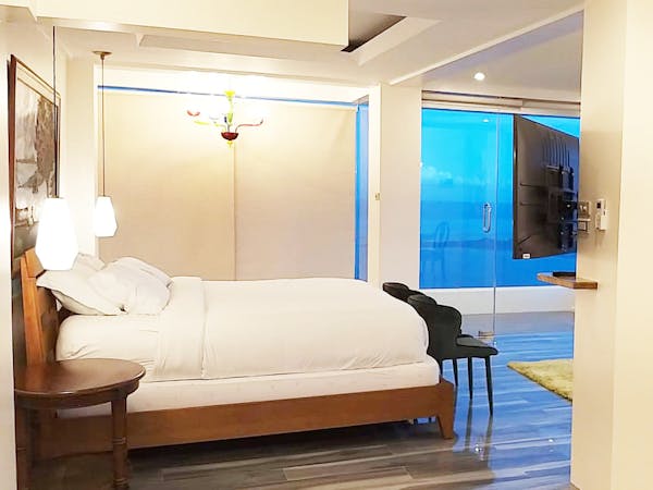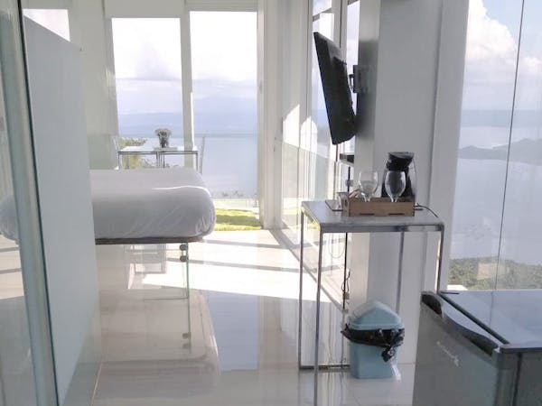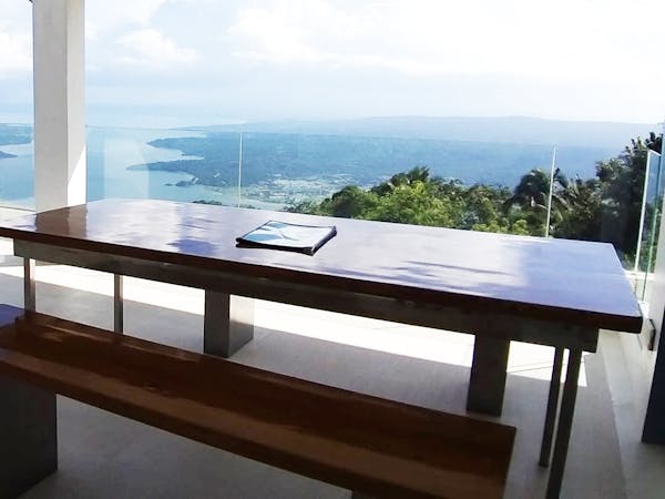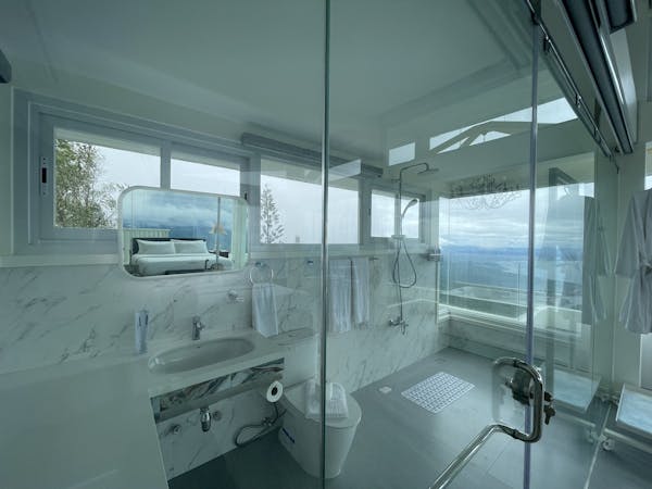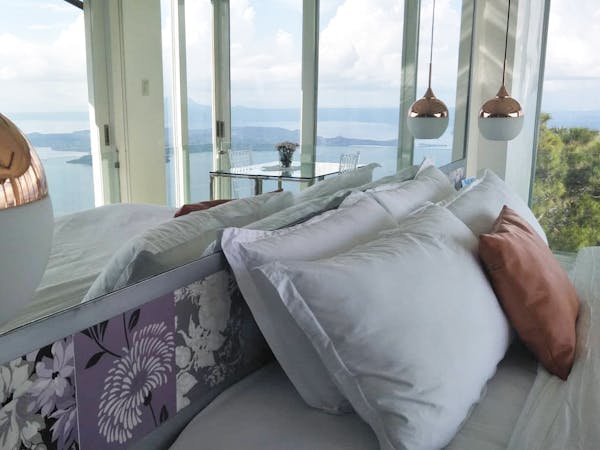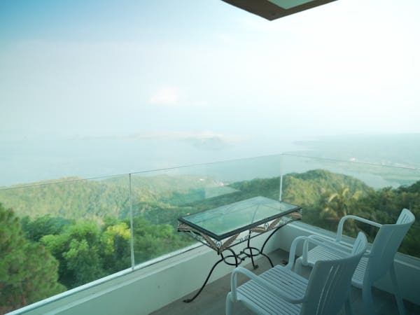 The Mid Pines Suite 2 (30 sqm) is a corner room that features an all glass concept with breathtaking views of the lake. The entry immediately reveals a picture window that frames the volcano island in the middle of Taal Lake. The suite boasts of floor-to-ceiling windows that are cleverly designed to open to the fullest thus converting the air conditioned sealed room to an open air balcony. It has an all glass bathroom wall with rain shower and an all glass dining table. Its king size bed faces the lake and has legs made of glass giving the impression that the bed is floating.
