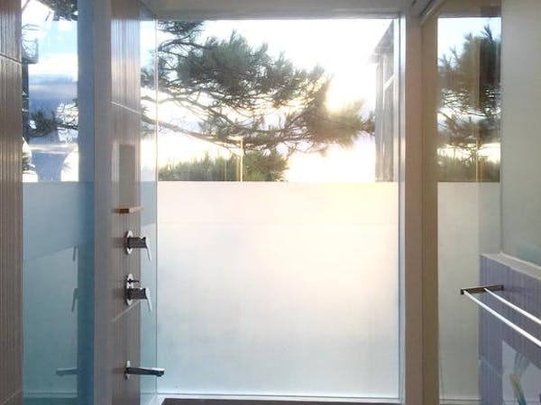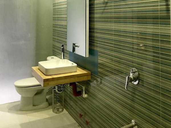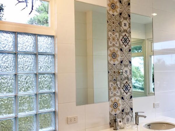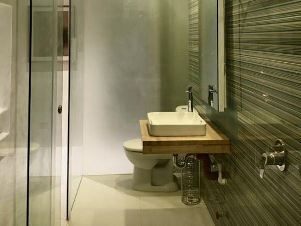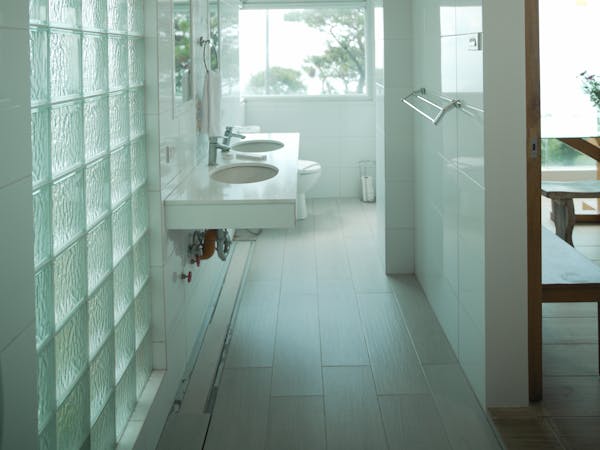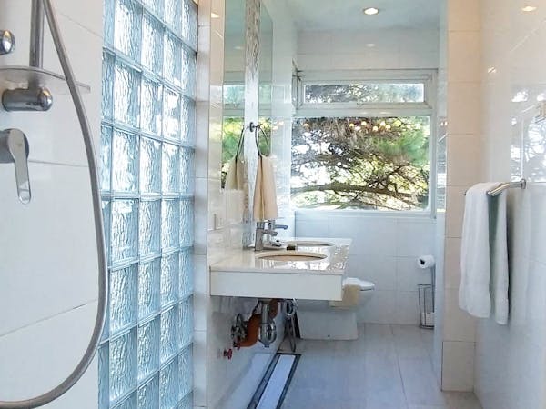 - a bathroom with two Grohe rain showers;