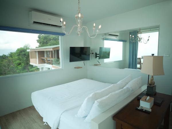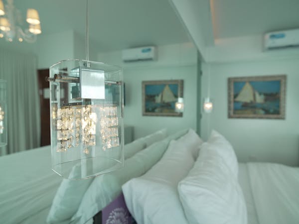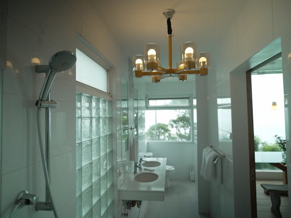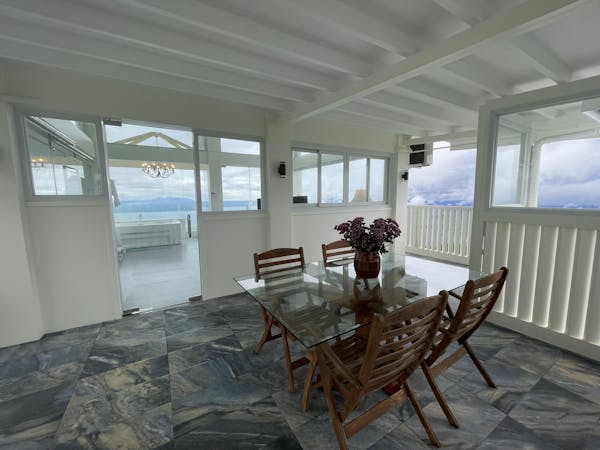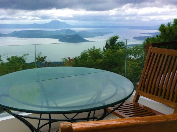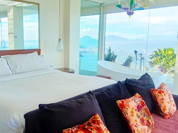 The Murano Suite is home to an assortment of fine Venetian glass lighting fixtures from chandeliers to scones to drop lights, all shipped by air from Murano. Like all our other rooms, The Murano Suite is a corner unit. It was designed to showcase the breathtaking lake view to the east (Lake Taal) and ocean views to the south (Balayan Bay and Batangas Bay).