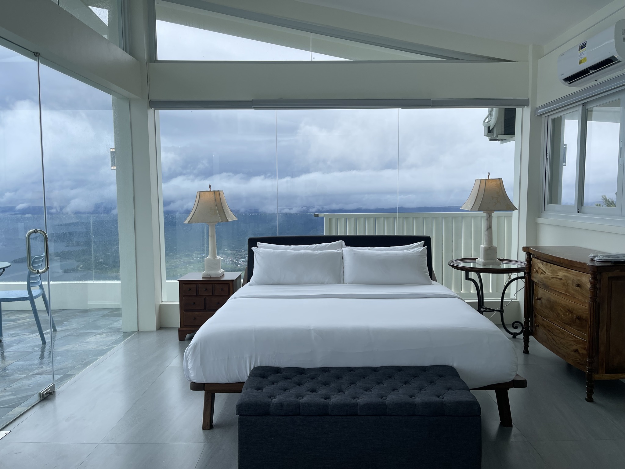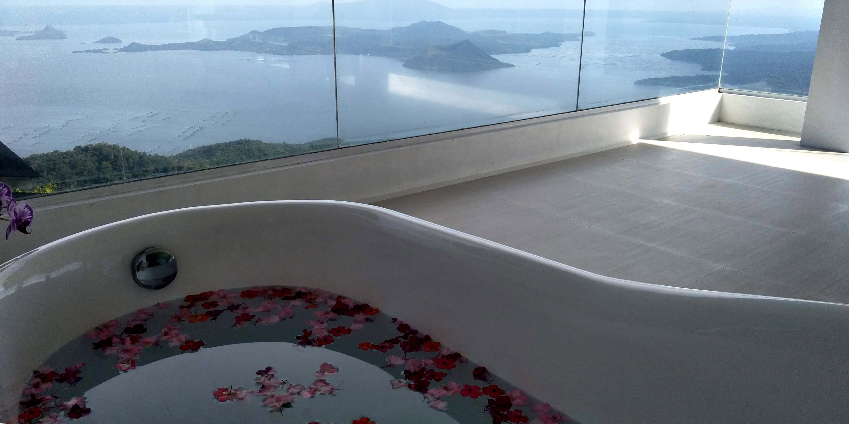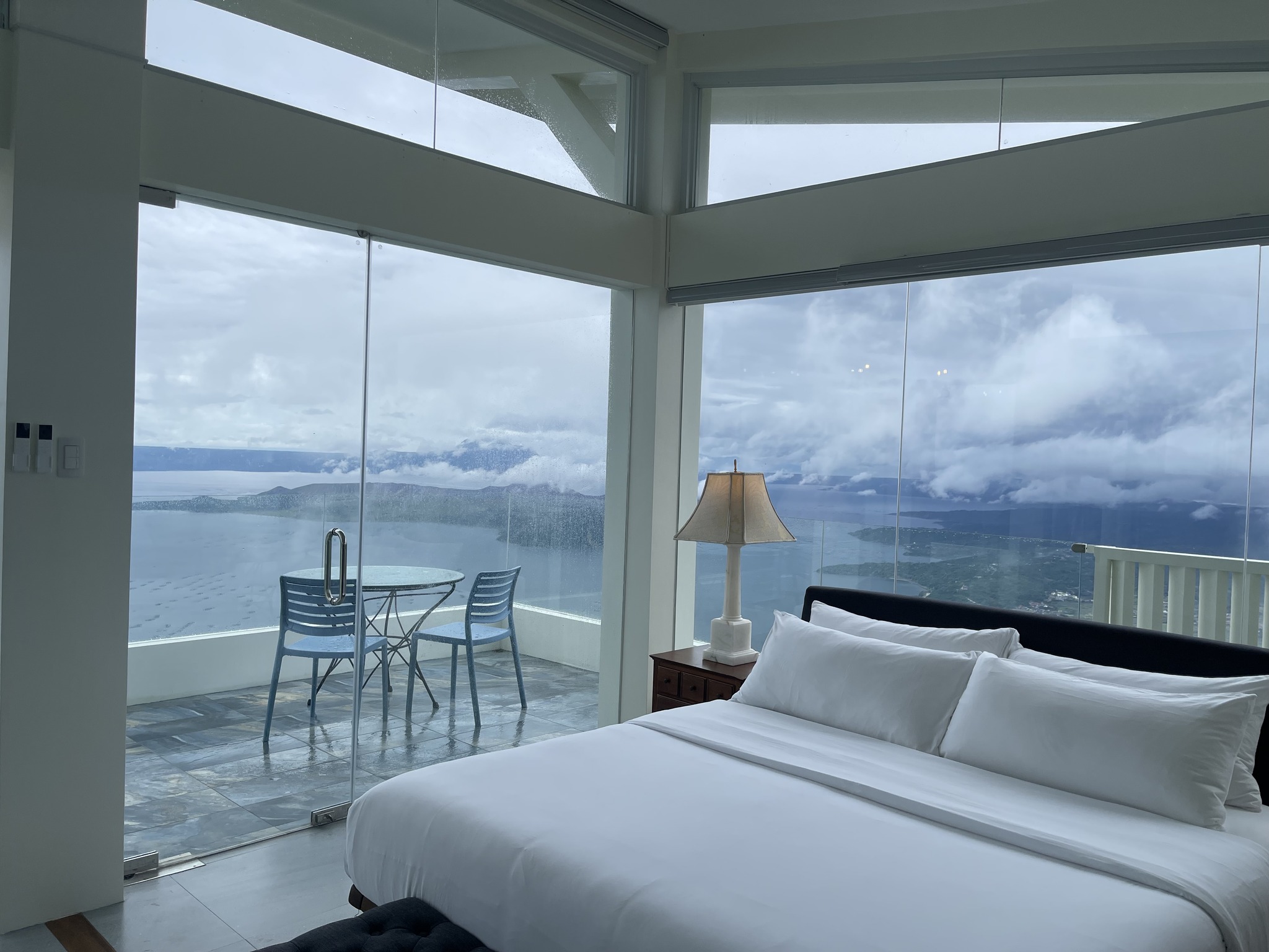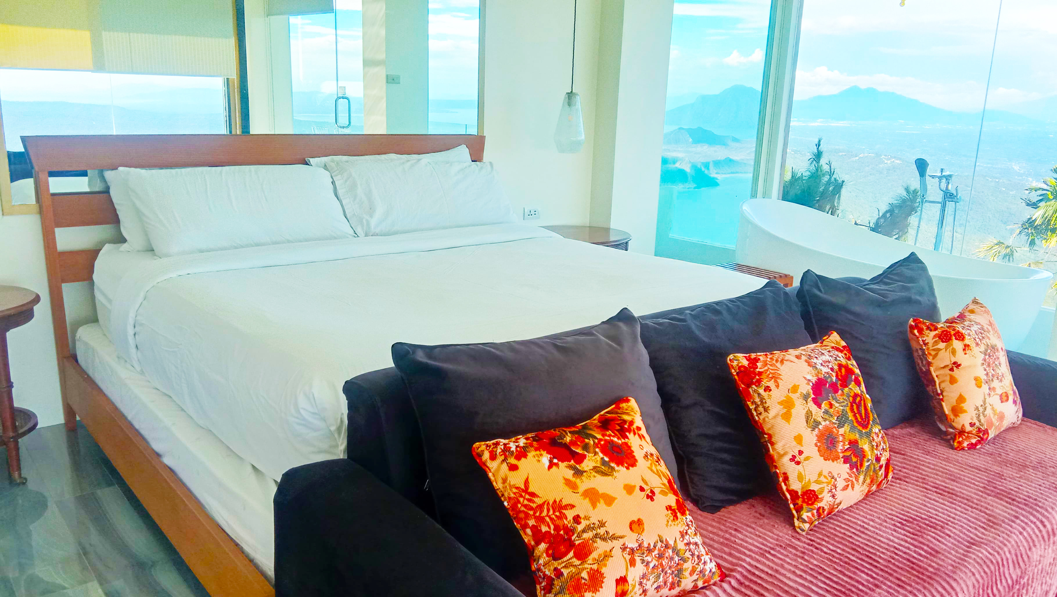 The Sky Cottage, a generous size of approximately 80sqm, is our latest addition to our portfolio of unique and oversized rooms. Situated in the highest point of our property, this showcases 360 degrees unobstructed views of the surroundings mountains, lake and city. It features a wrap around balcony that lends the feel of a cottage floating in the sky. The room's interior design fosters a feeling of being in the middle of the clouds and one with the sky. The furniture and fixtures are of the best quality with all Grohe fixtures and mostly Ethan Allen furniture. The focal point of the room is a large whirlpool tub that can accommodate two and offers the same breathtaking, unobstructed view of Taal Lake. The black out blinds are motorized and are opened and closed with the touch of a button. A stay at The Sky Cottage is truly an experience in itself.