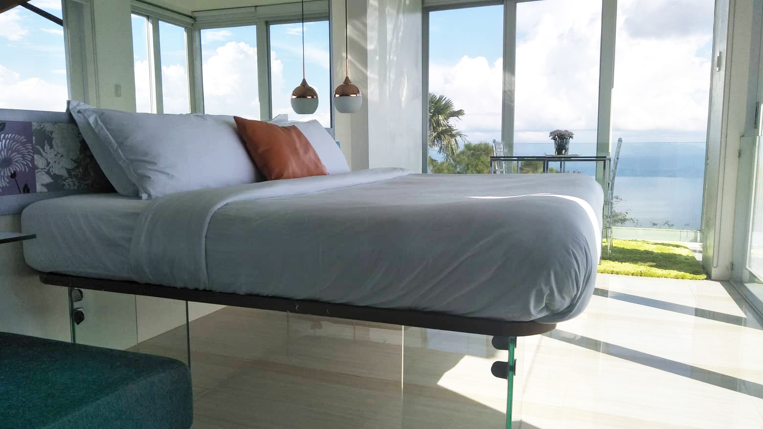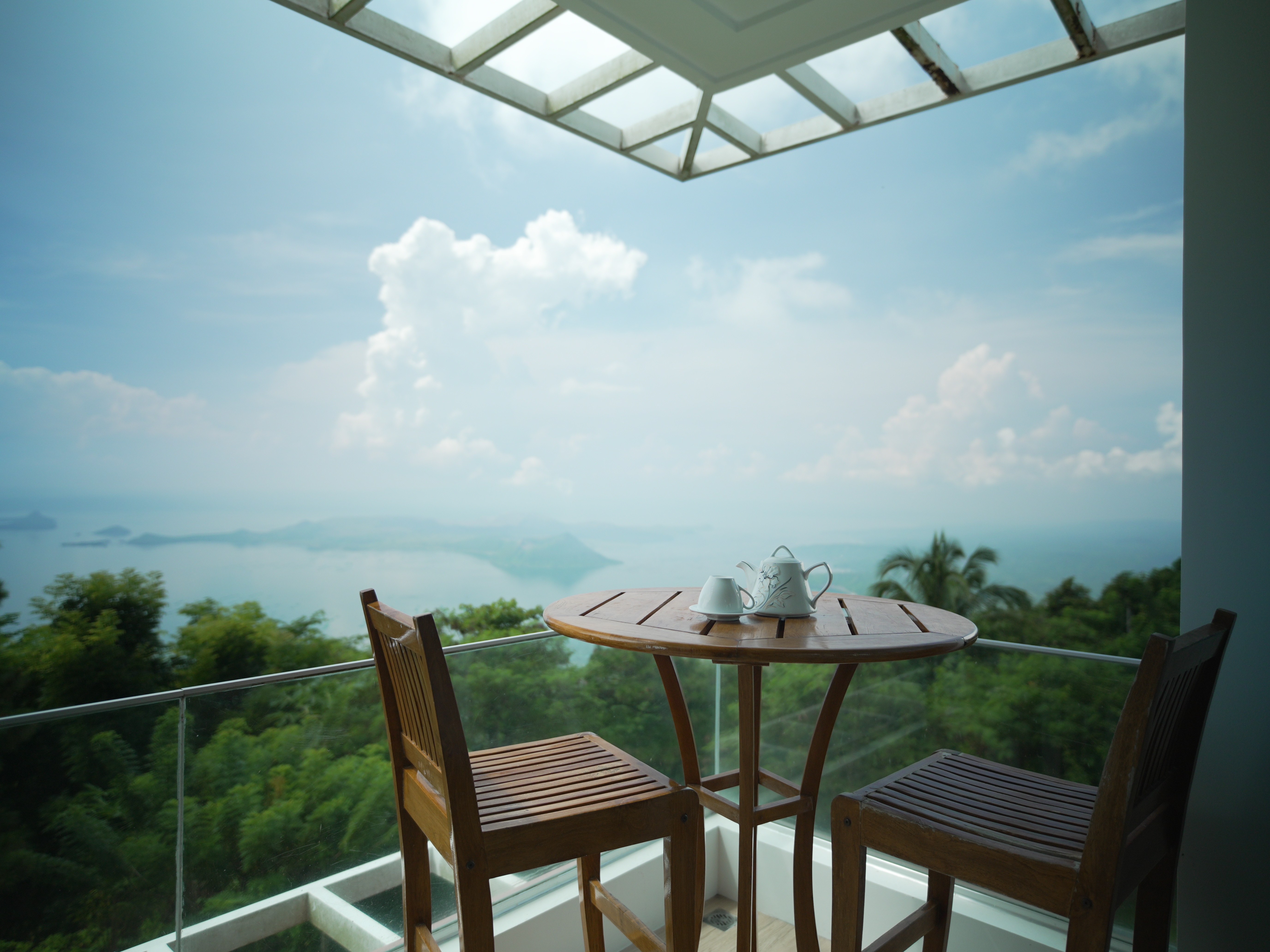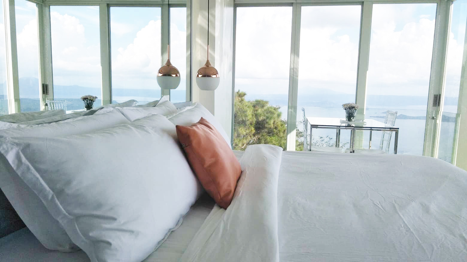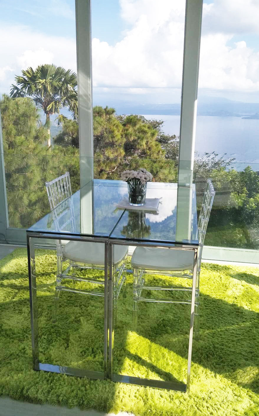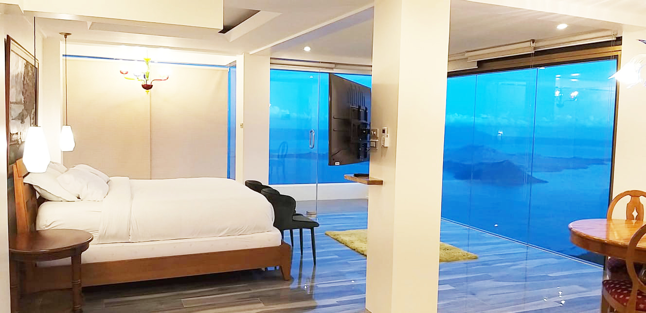 The Mid Pines Suite 2 (30 sqm) is a corner room that features an all glass concept with breathtaking views of the lake. The entry immediately reveals a picture window that frames the volcano island in the middle of Taal Lake. The suite boasts of floor-to-ceiling windows that are cleverly designed to open to the fullest thus converting the air conditioned sealed room to an open air balcony. It has an all glass bathroom wall with rain shower and an all glass dining table. Its king size bed faces the lake and has legs made of glass giving the impression that the bed is floating.