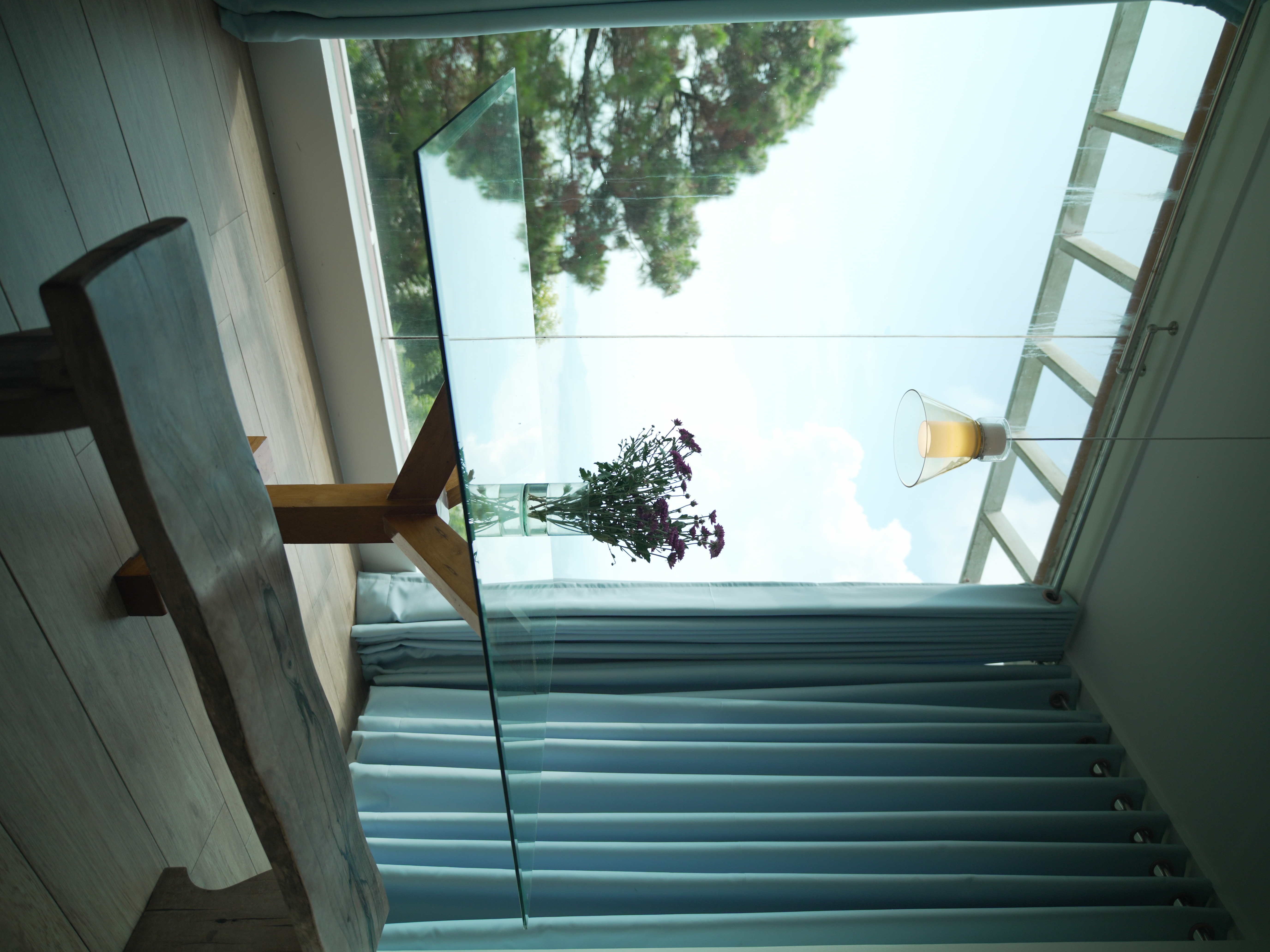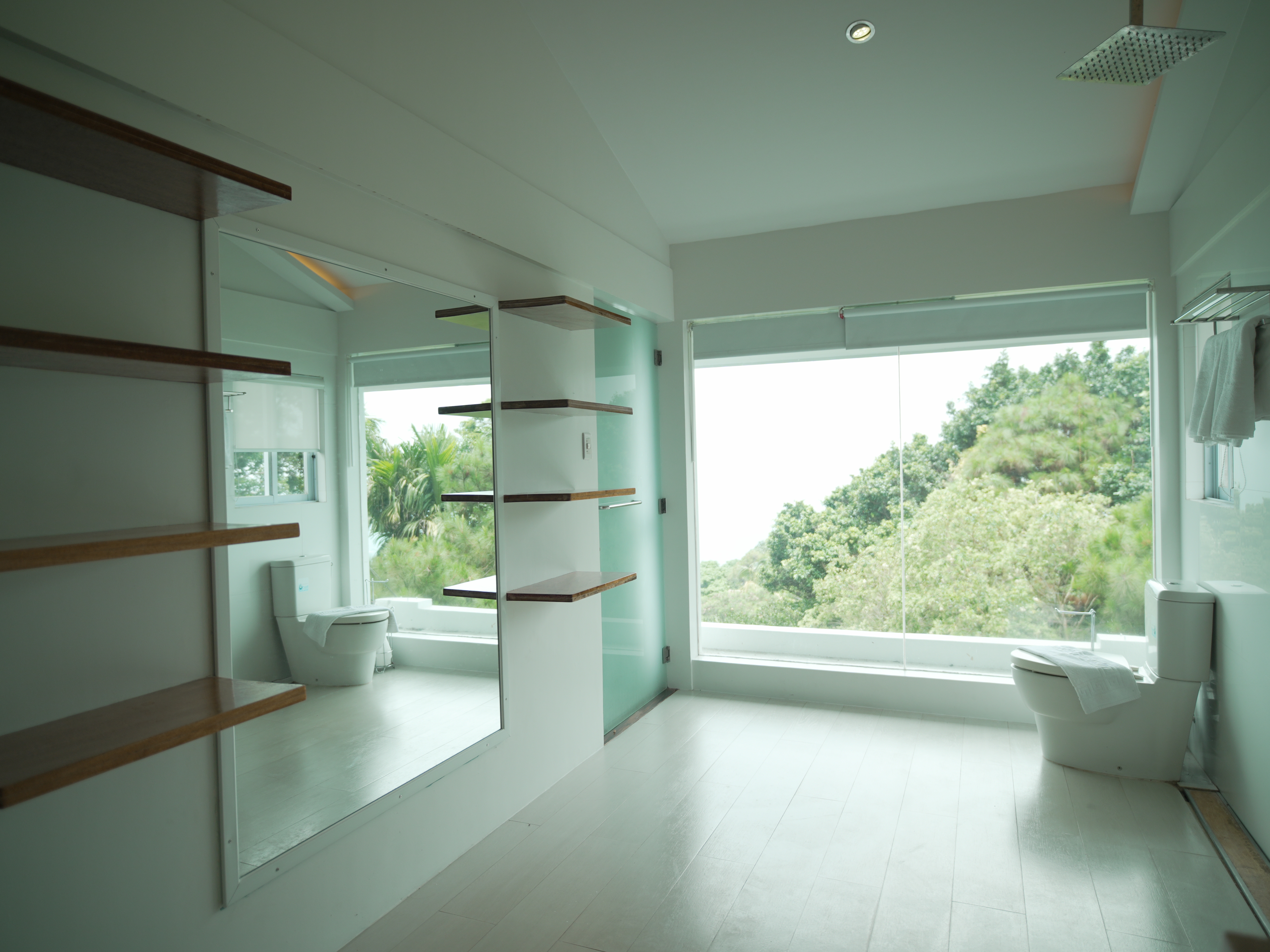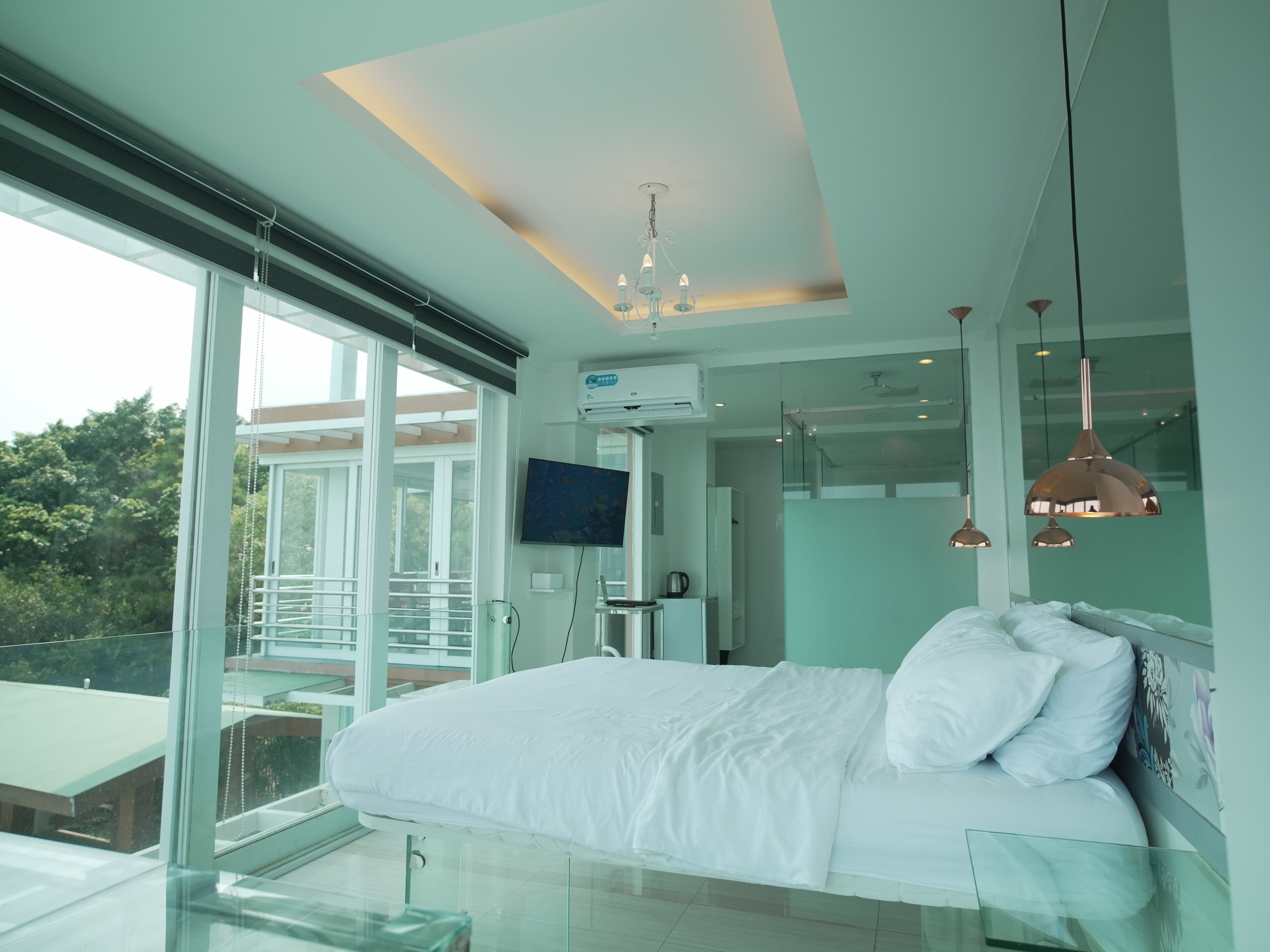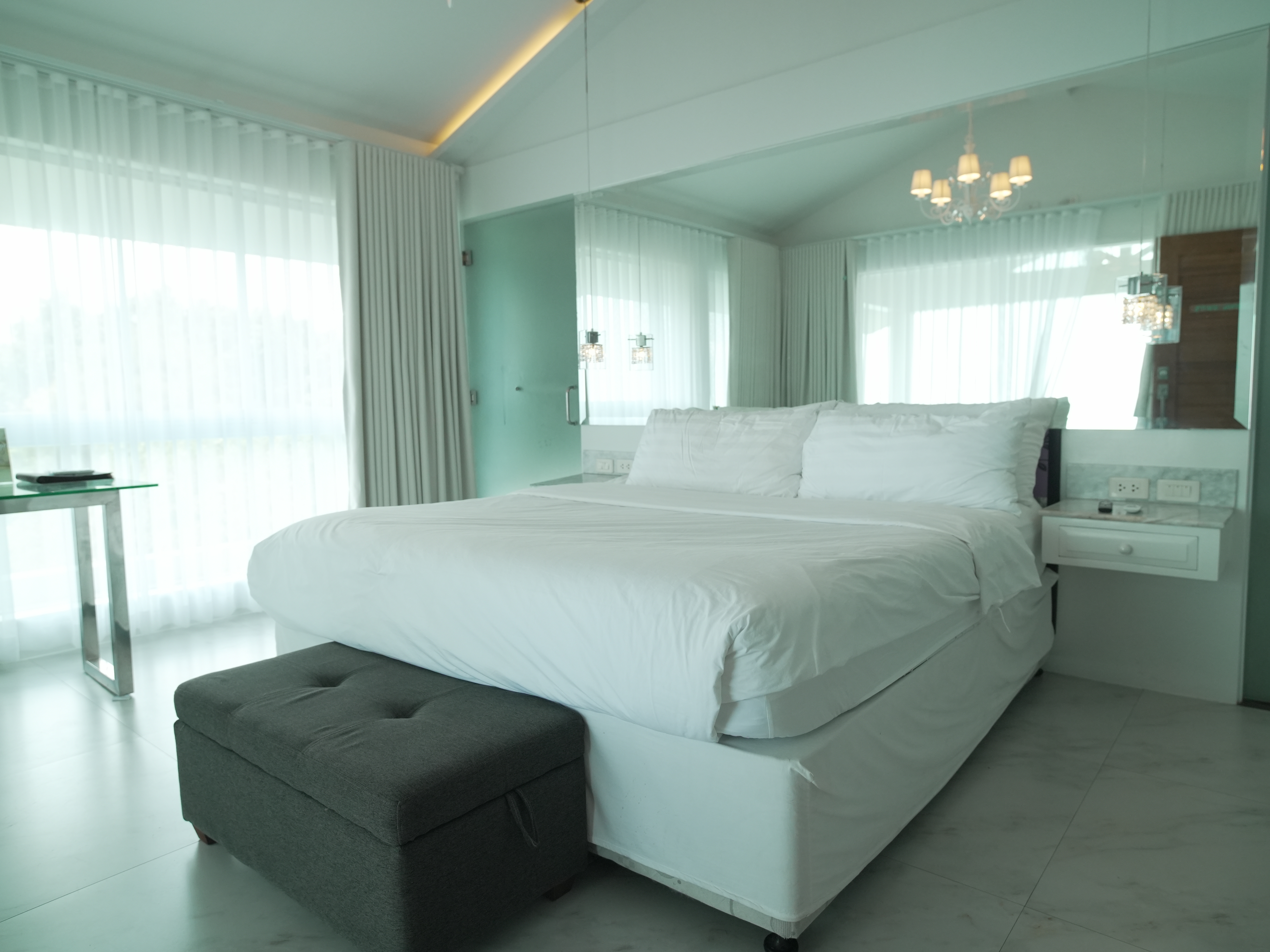 The Mid Pines Suite 2 (30 sqm) is a corner room that features an all glass concept with breathtaking views of the lake. The entry immediately reveals a picture window that frames the volcano island in the middle of Taal Lake. The suite boasts of floor-to-ceiling windows that are cleverly designed to open to the fullest thus converting the air conditioned sealed room to an open air balcony. It has an all glass bathroom wall with rain shower and an all glass dining table. Its king size bed faces the lake and has legs made of glass giving the impression that the bed is floating.
