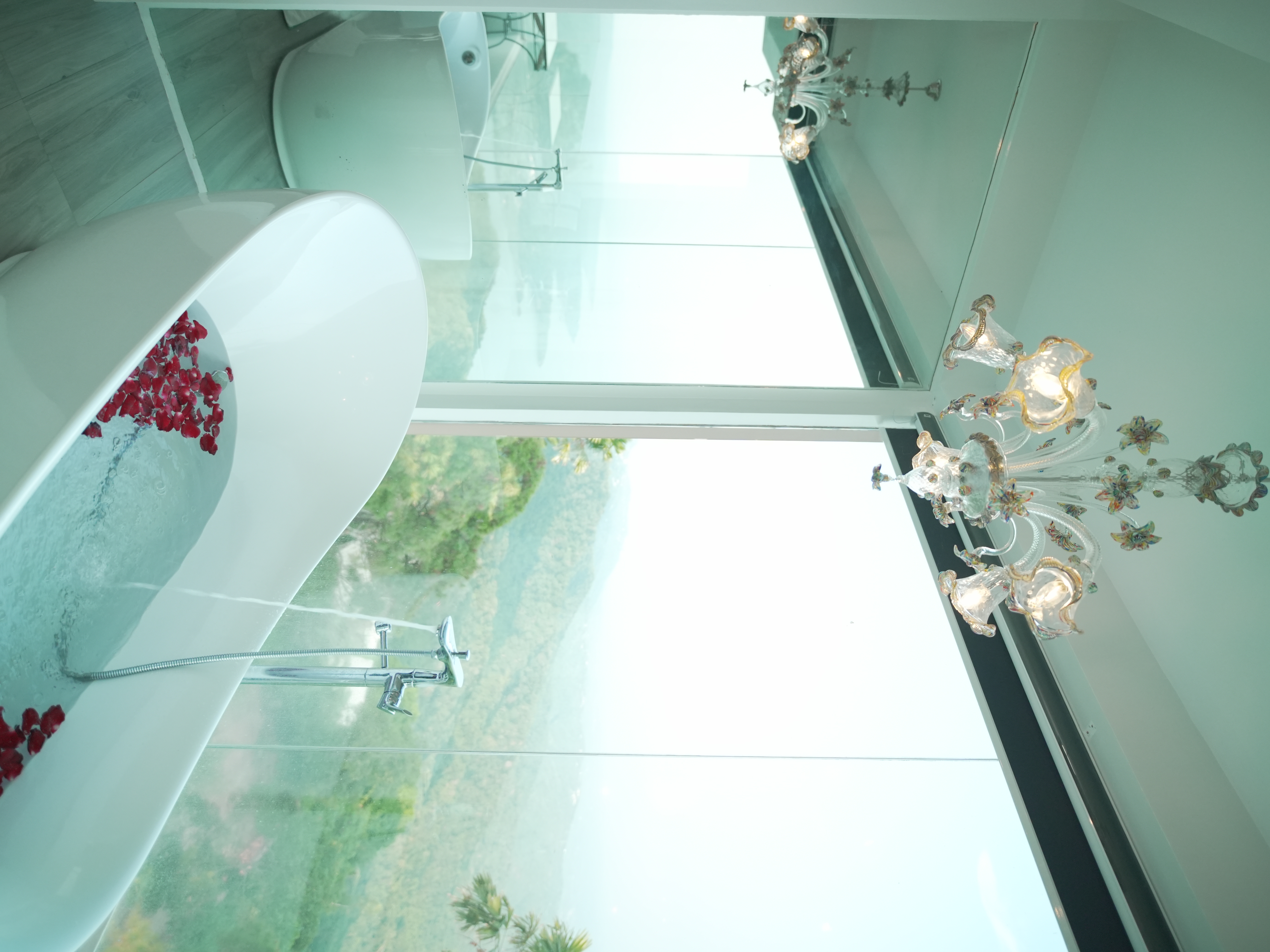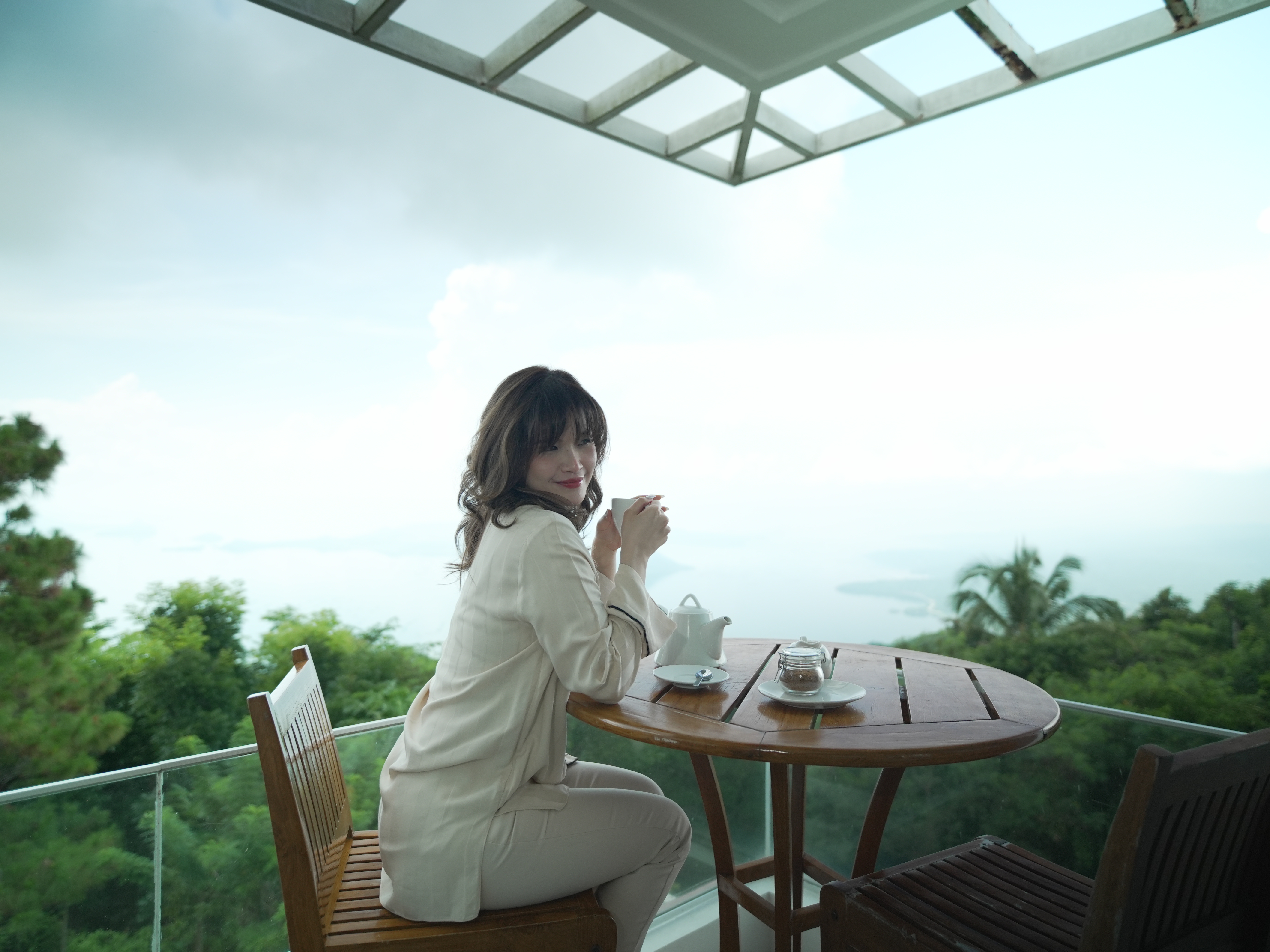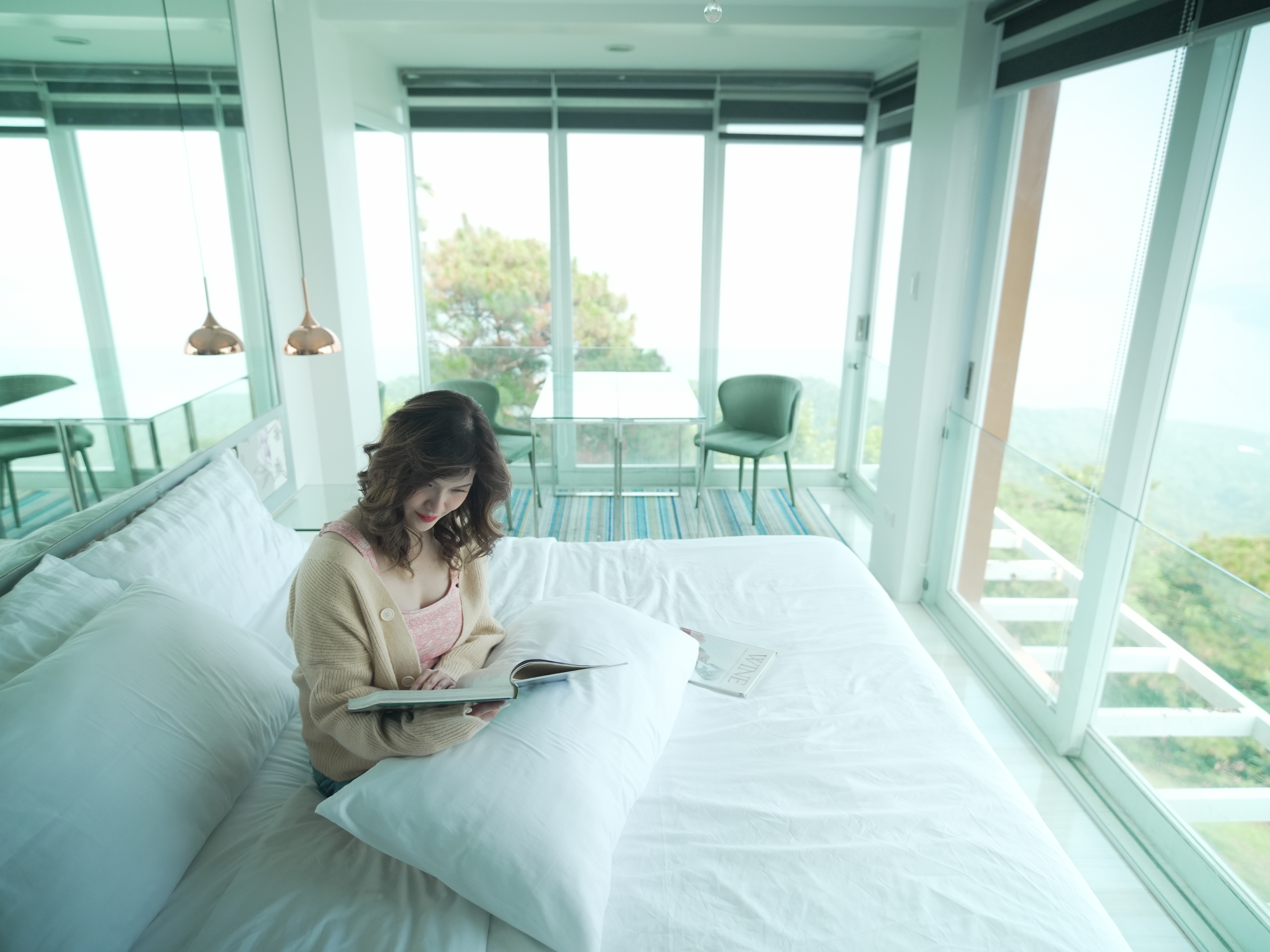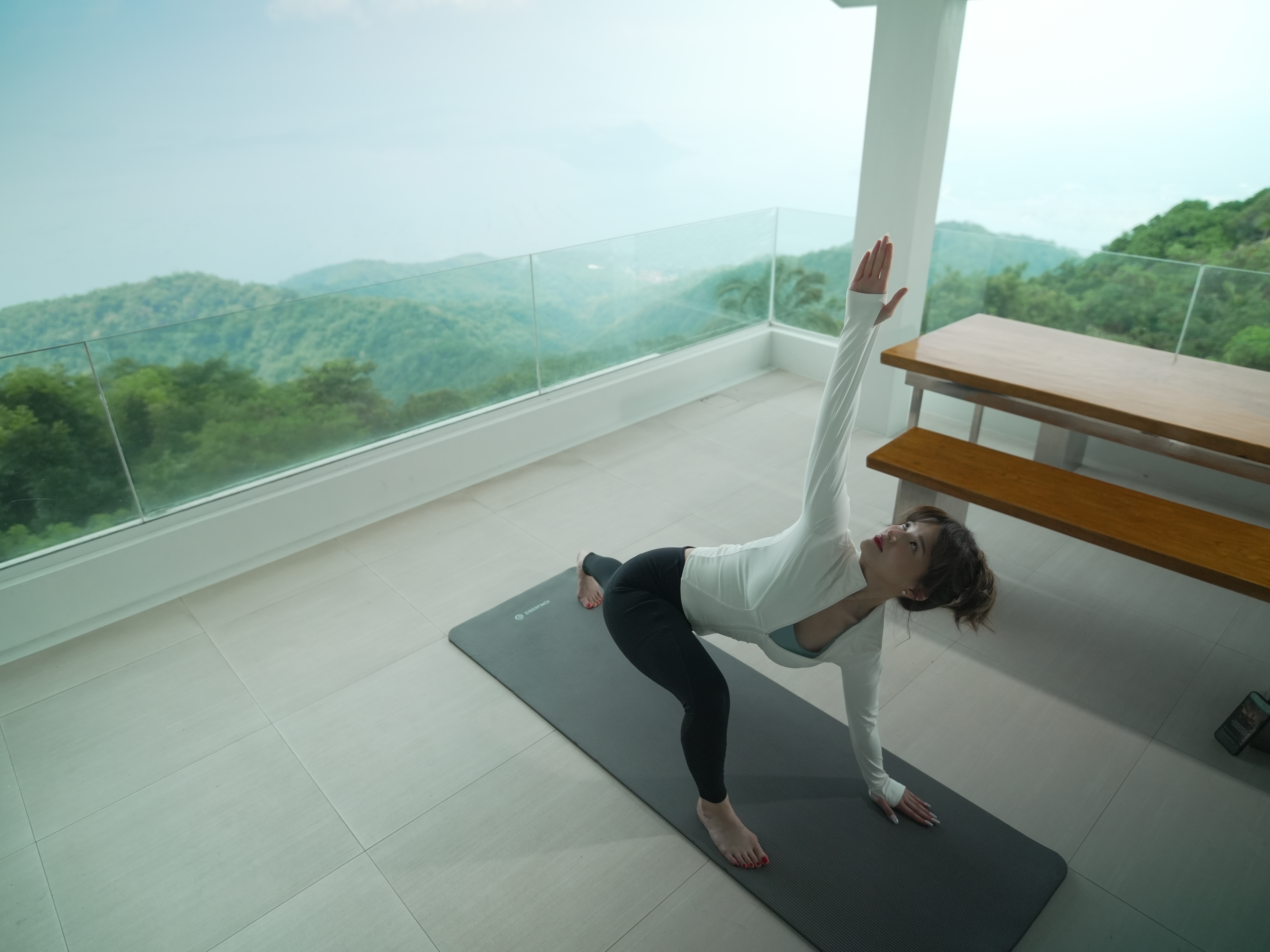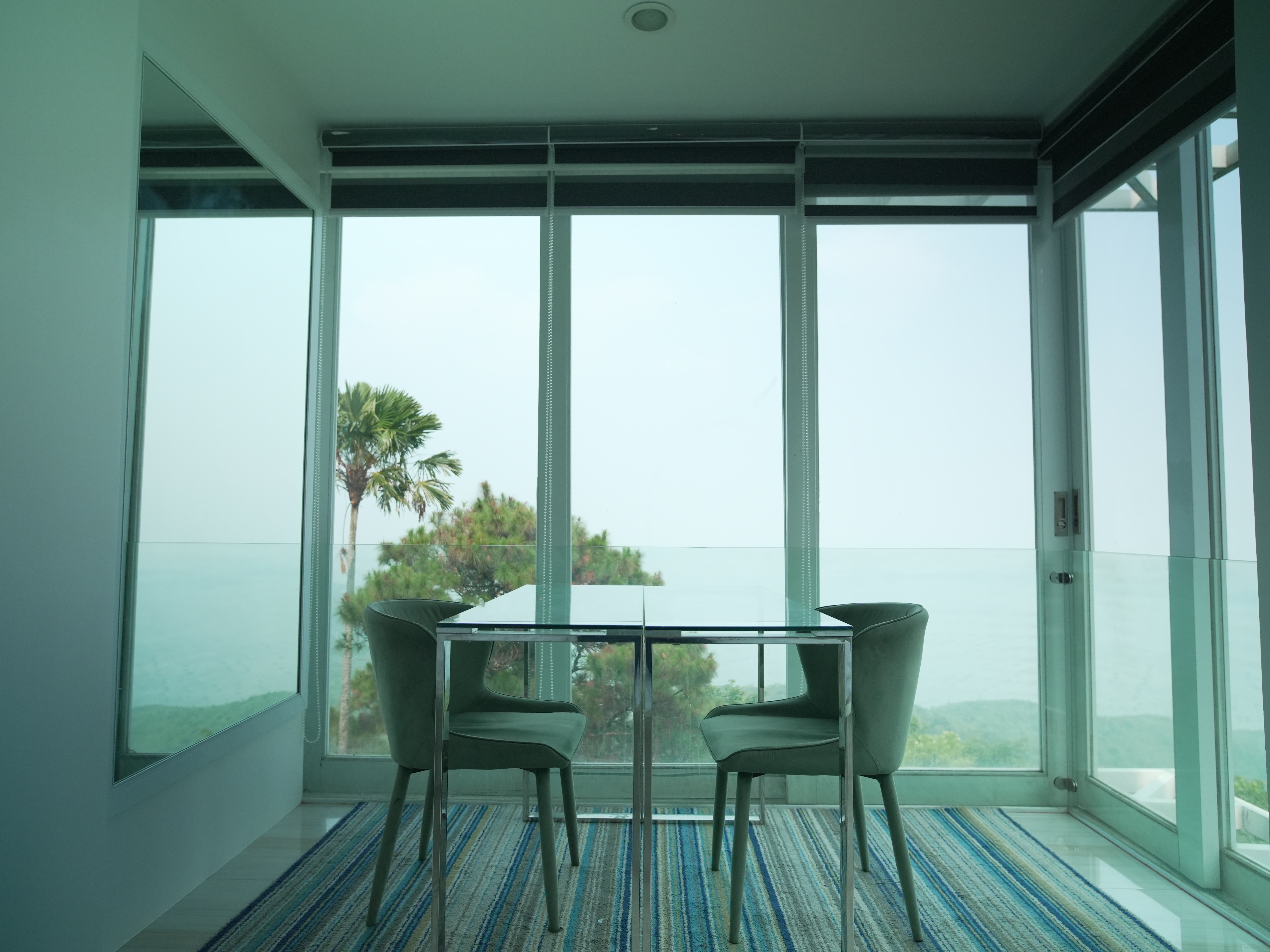 The Mid Pines Suite 2 (30 sqm) is a corner room that features an all glass concept with breathtaking views of the lake. The entry immediately reveals a picture window that frames the volcano island in the middle of Taal Lake. The suite boasts of floor-to-ceiling windows that are cleverly designed to open to the fullest thus converting the air conditioned sealed room to an open air balcony. It has an all glass bathroom wall with rain shower and an all glass dining table. Its king size bed faces the lake and has legs made of glass giving the impression that the bed is floating.