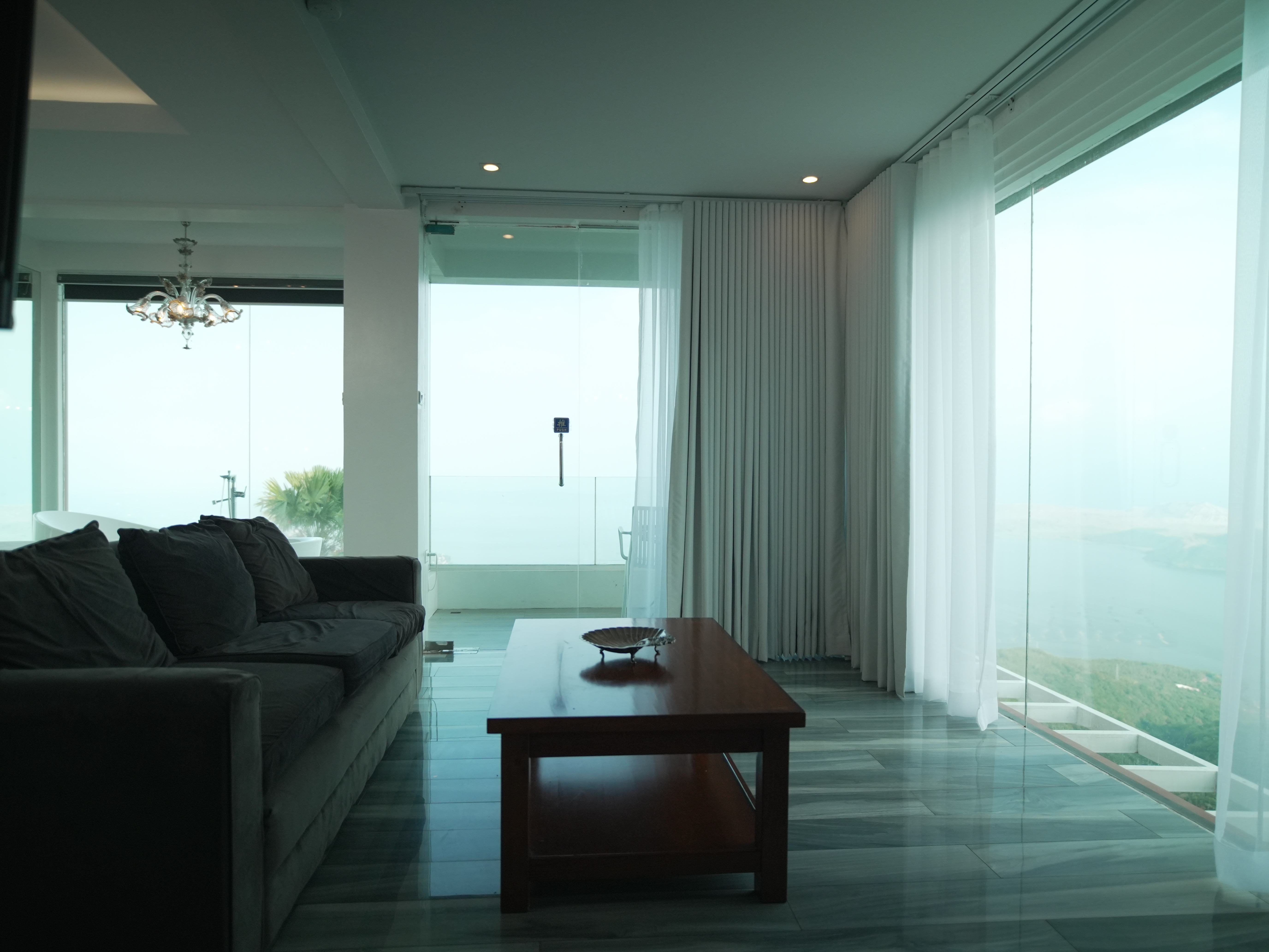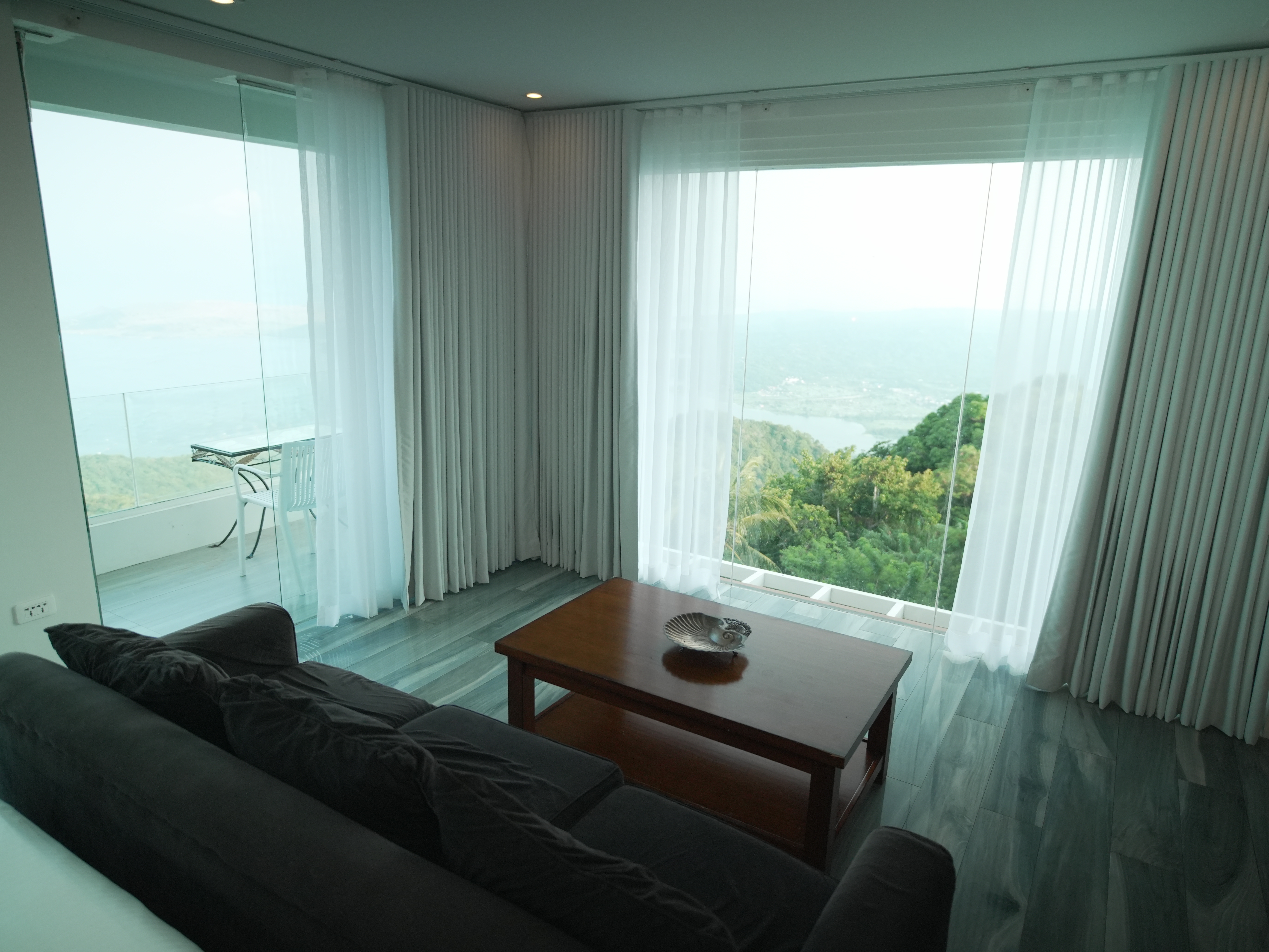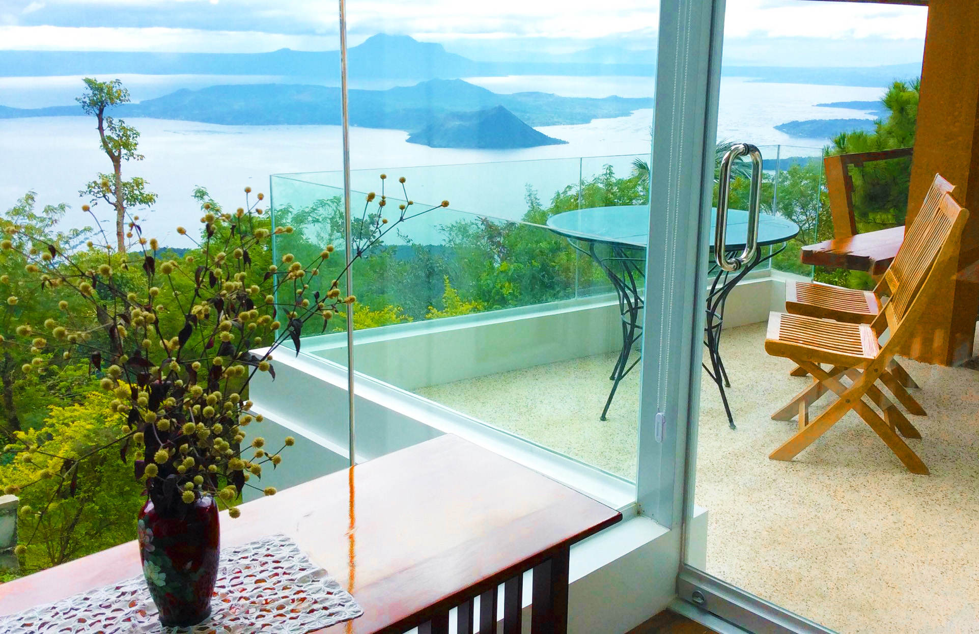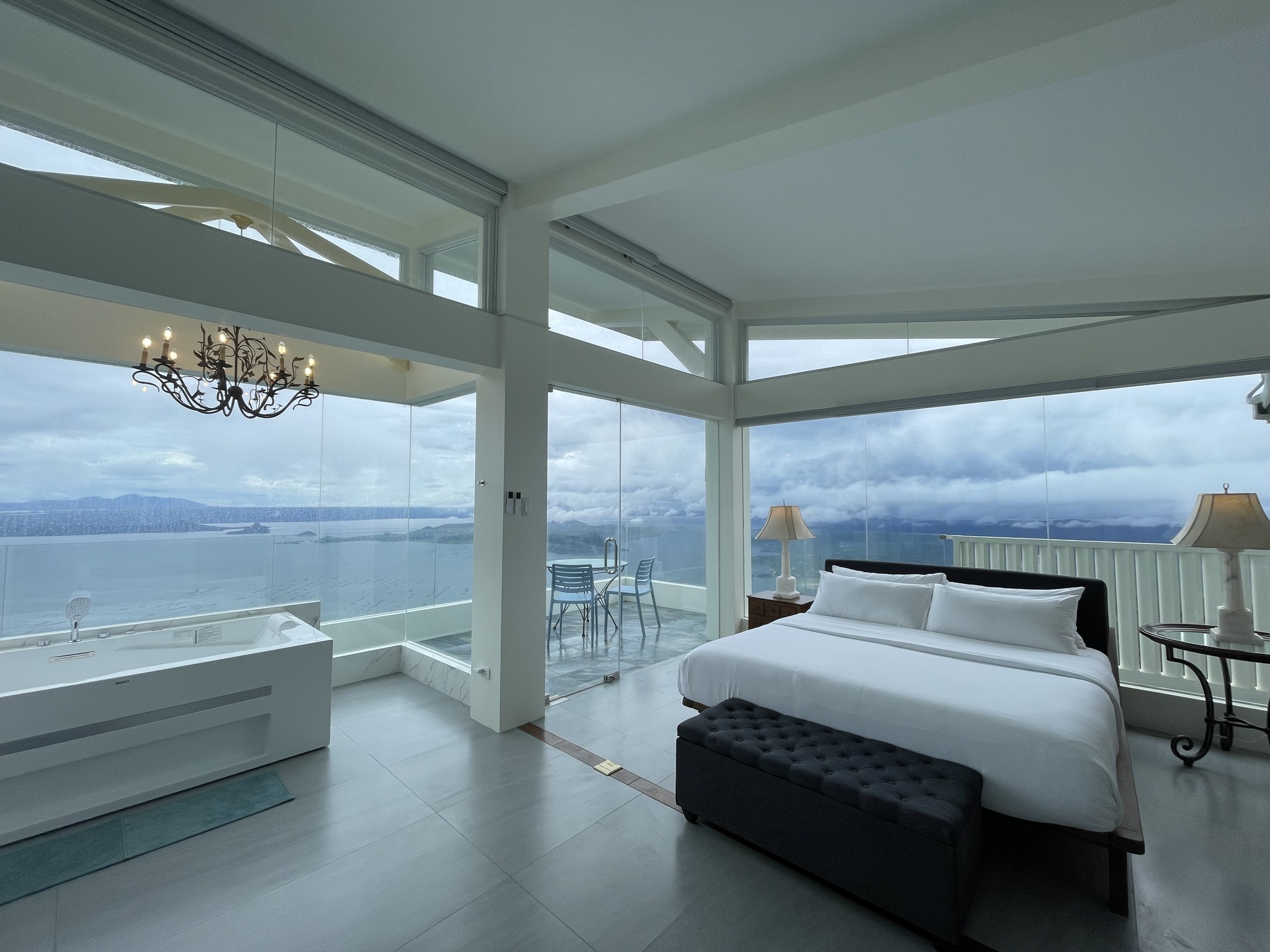 The Murano Suite is home to an assortment of fine Venetian glass lighting fixtures from chandeliers to scones to drop lights, all shipped by air from Murano. Like all our other rooms, The Murano Suite is a corner unit. It was designed to showcase the breathtaking lake view to the east (Lake Taal) and ocean views to the south (Balayan Bay and Batangas Bay).