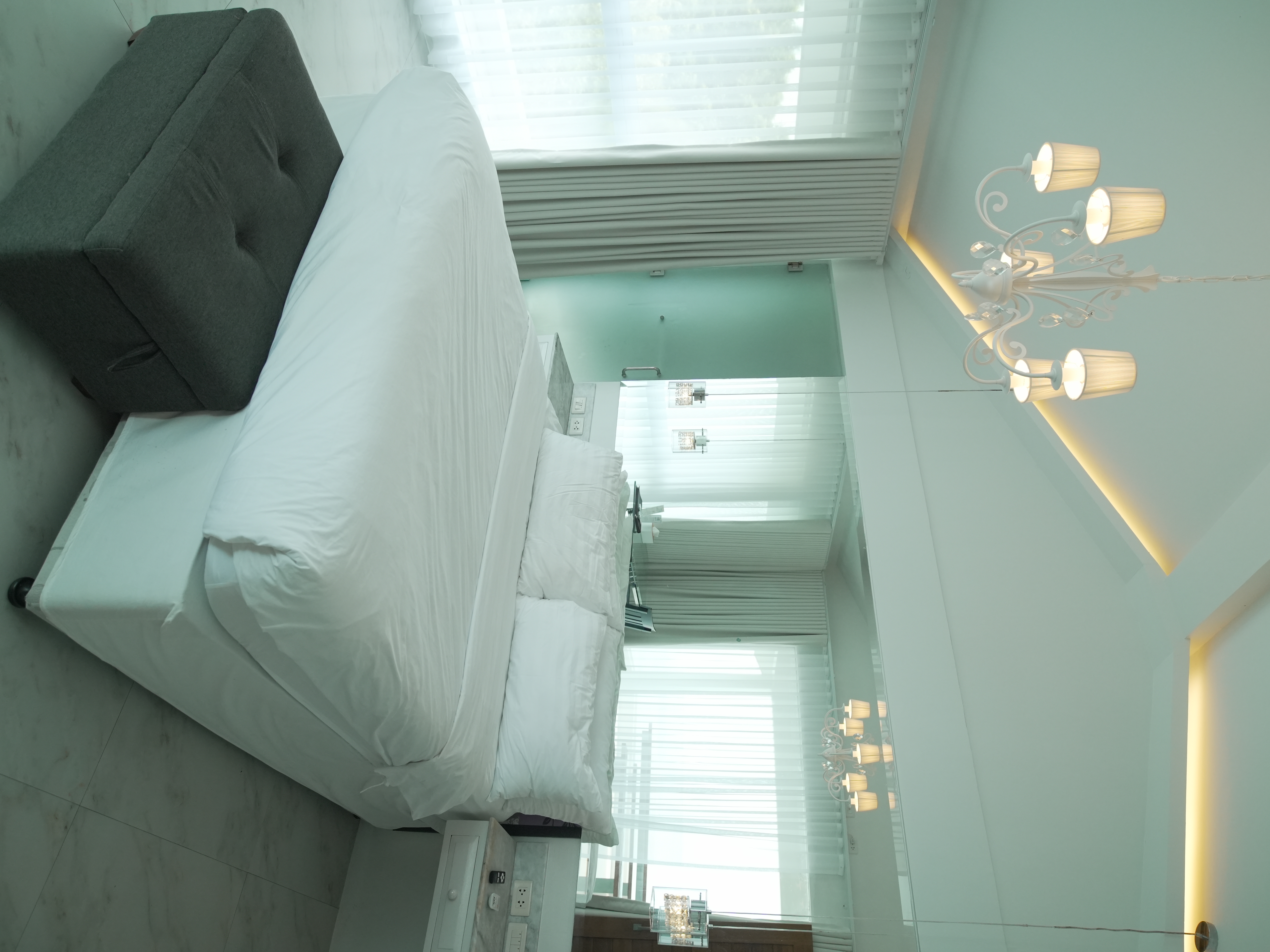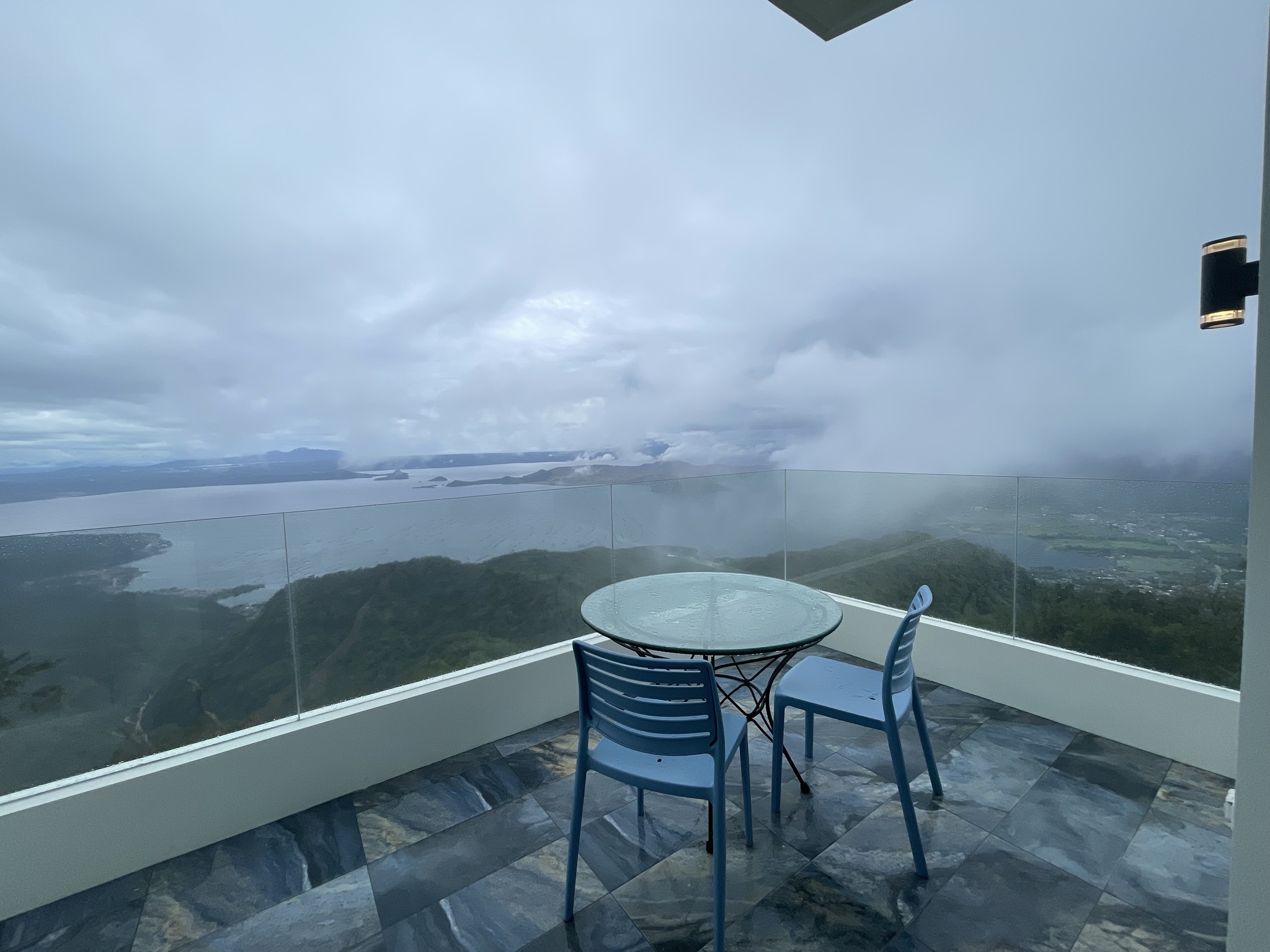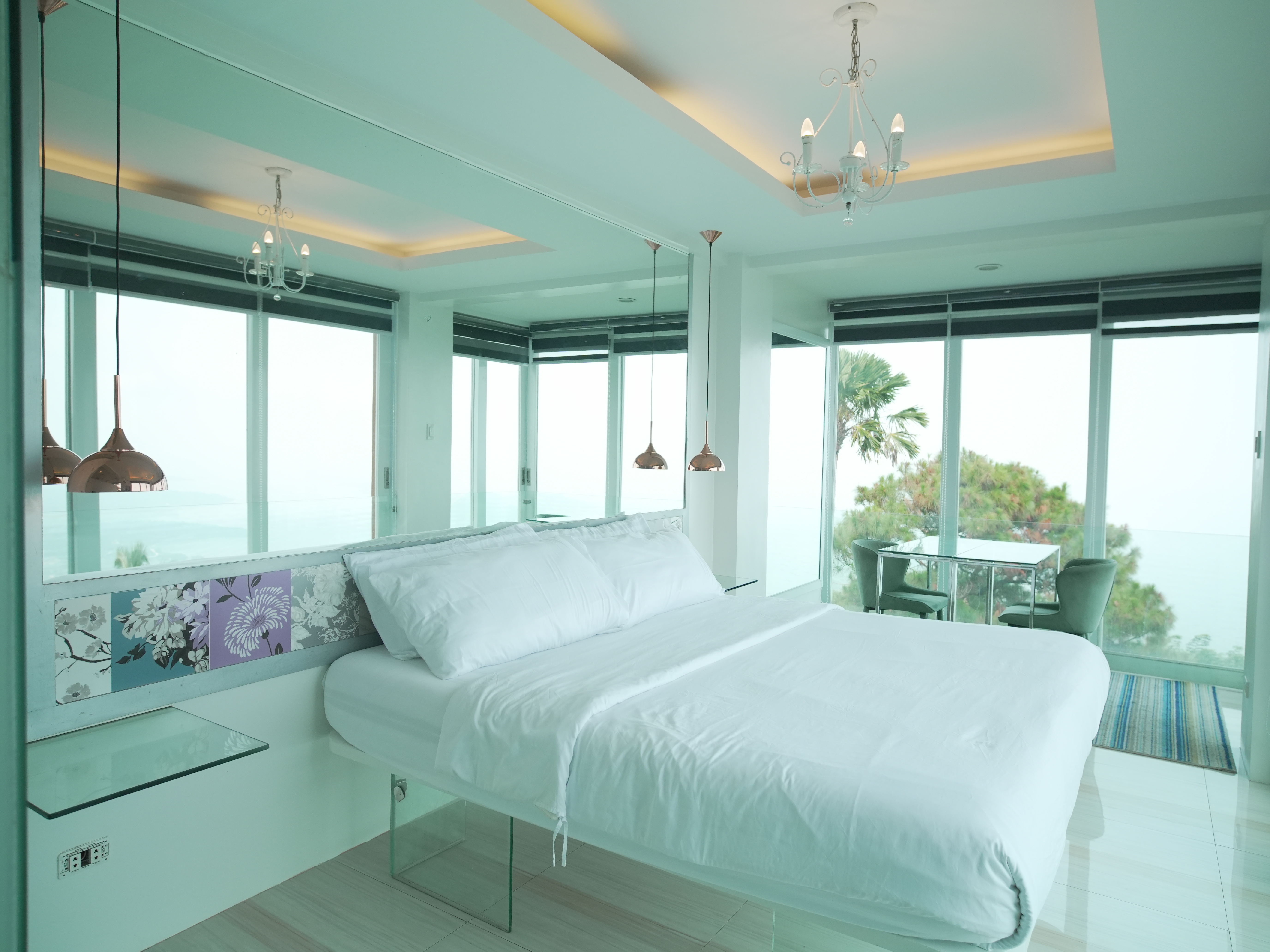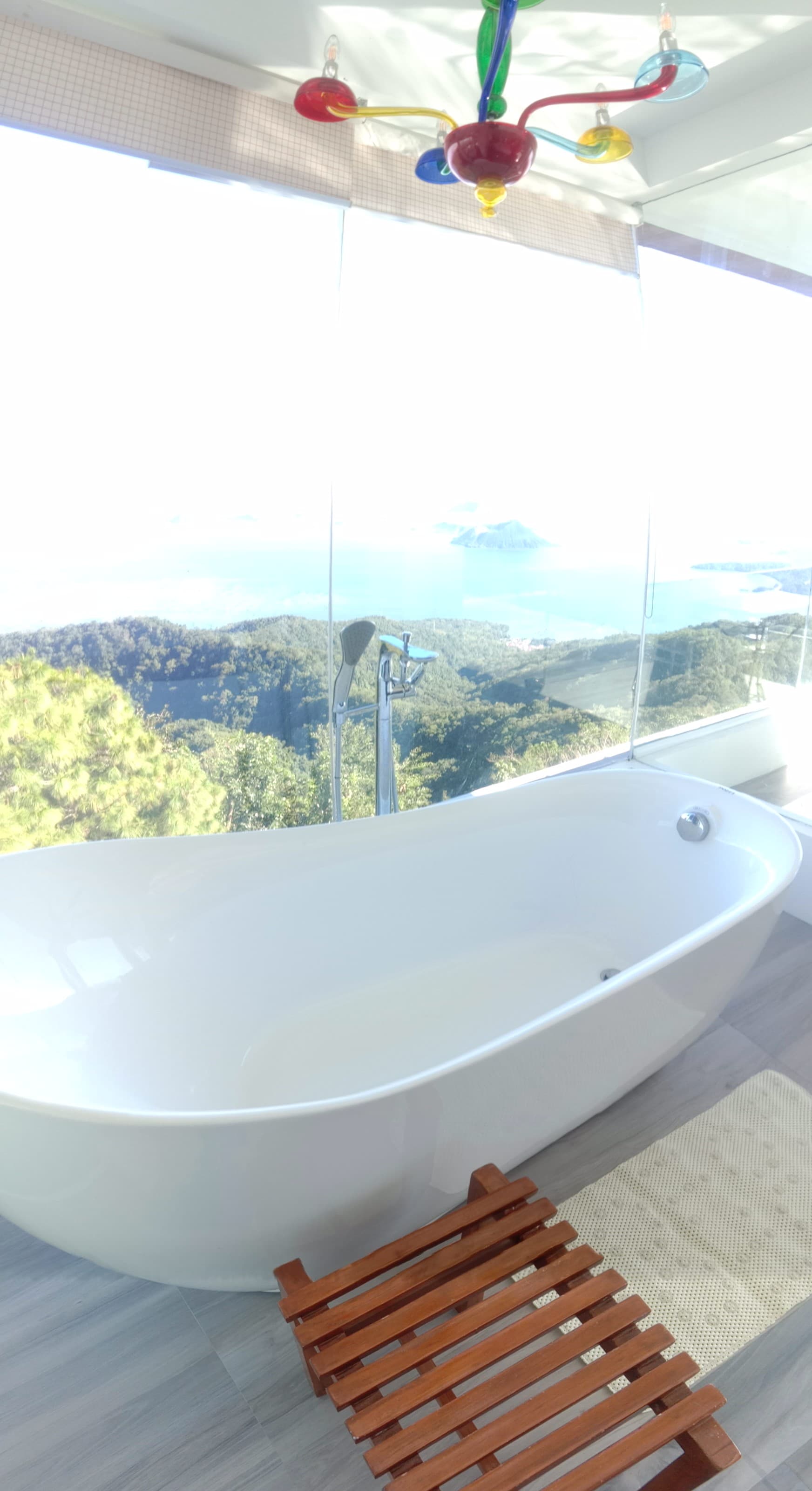 The Murano Suite is home to an assortment of fine Venetian glass lighting fixtures from chandeliers to scones to drop lights, all shipped by air from Murano. Like all our other rooms, The Murano Suite is a corner unit. It was designed to showcase the breathtaking lake view to the east (Lake Taal) and ocean views to the south (Balayan Bay and Batangas Bay).