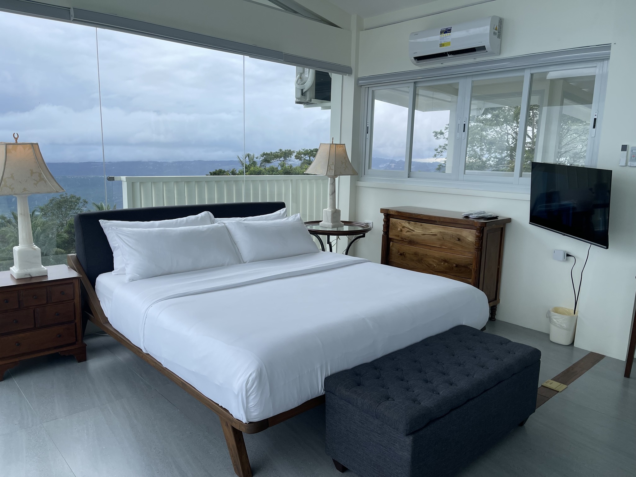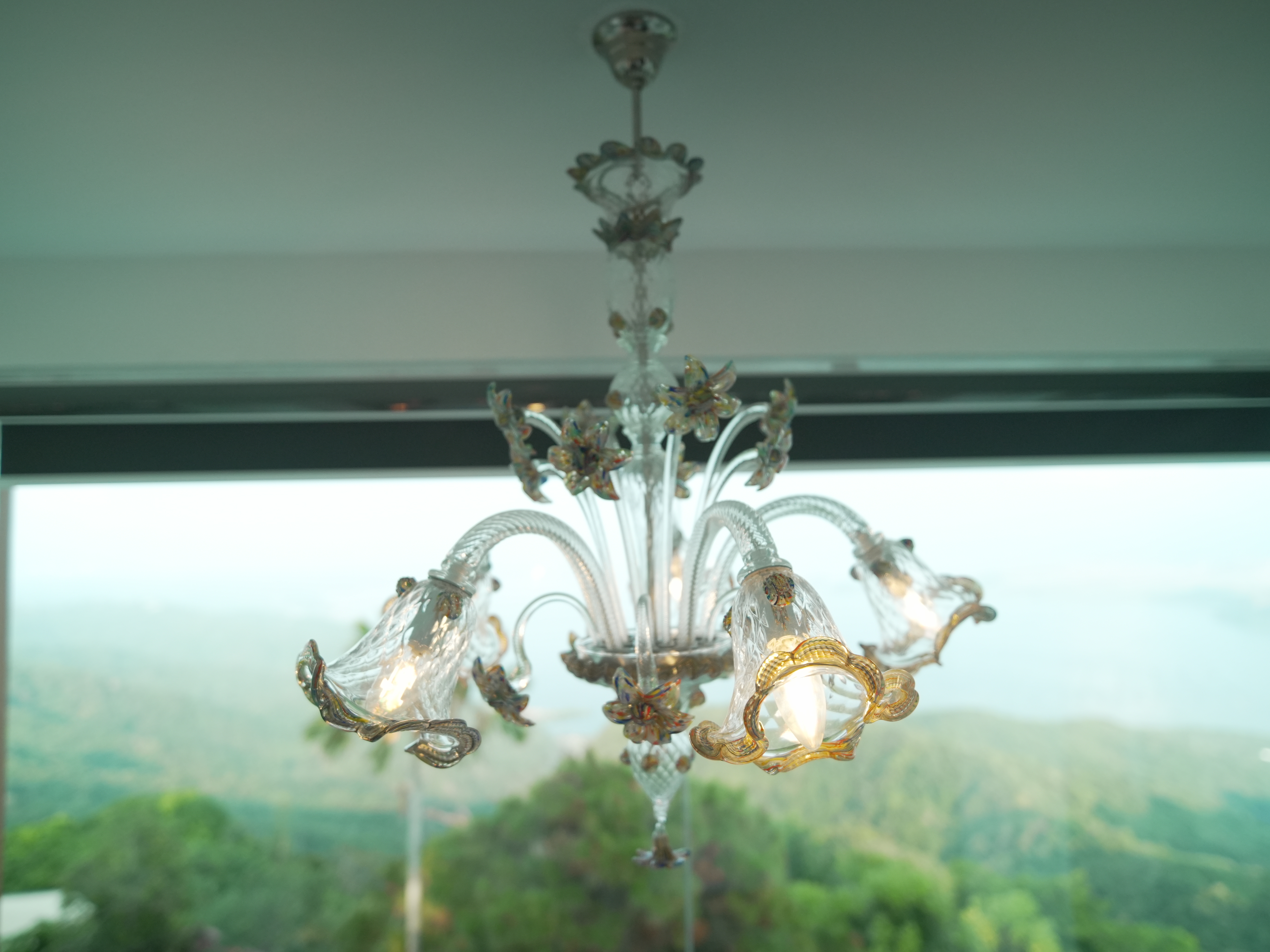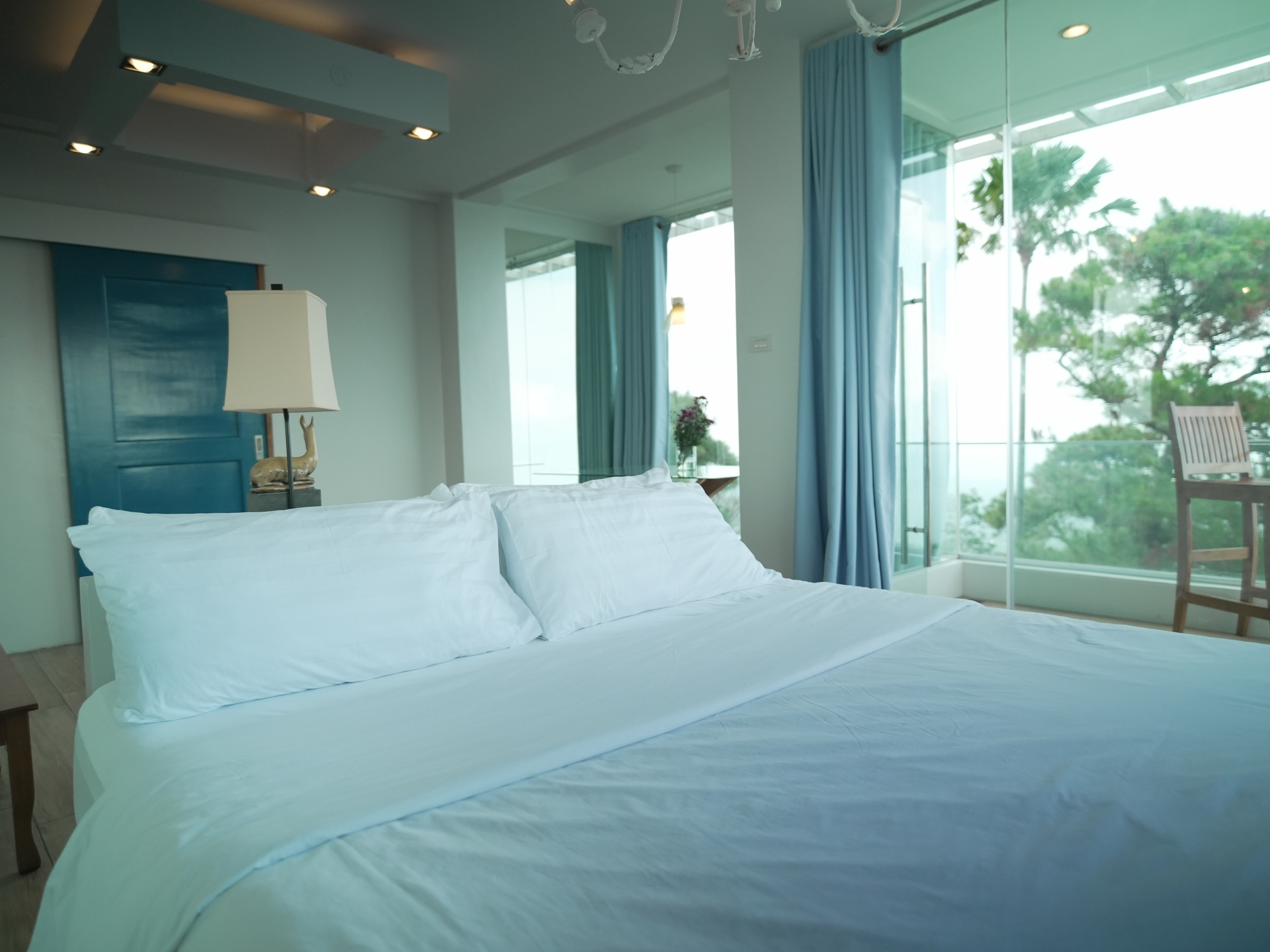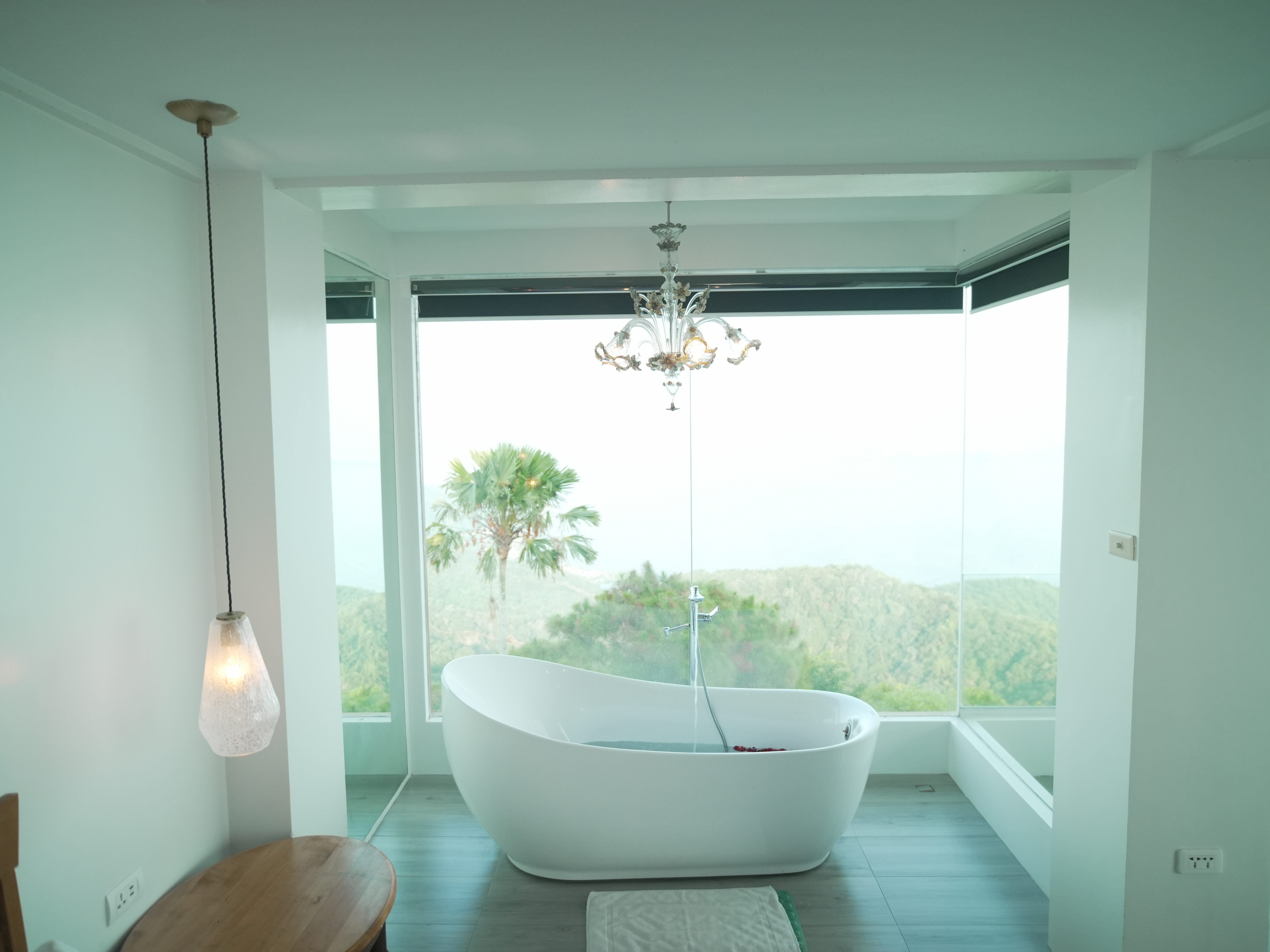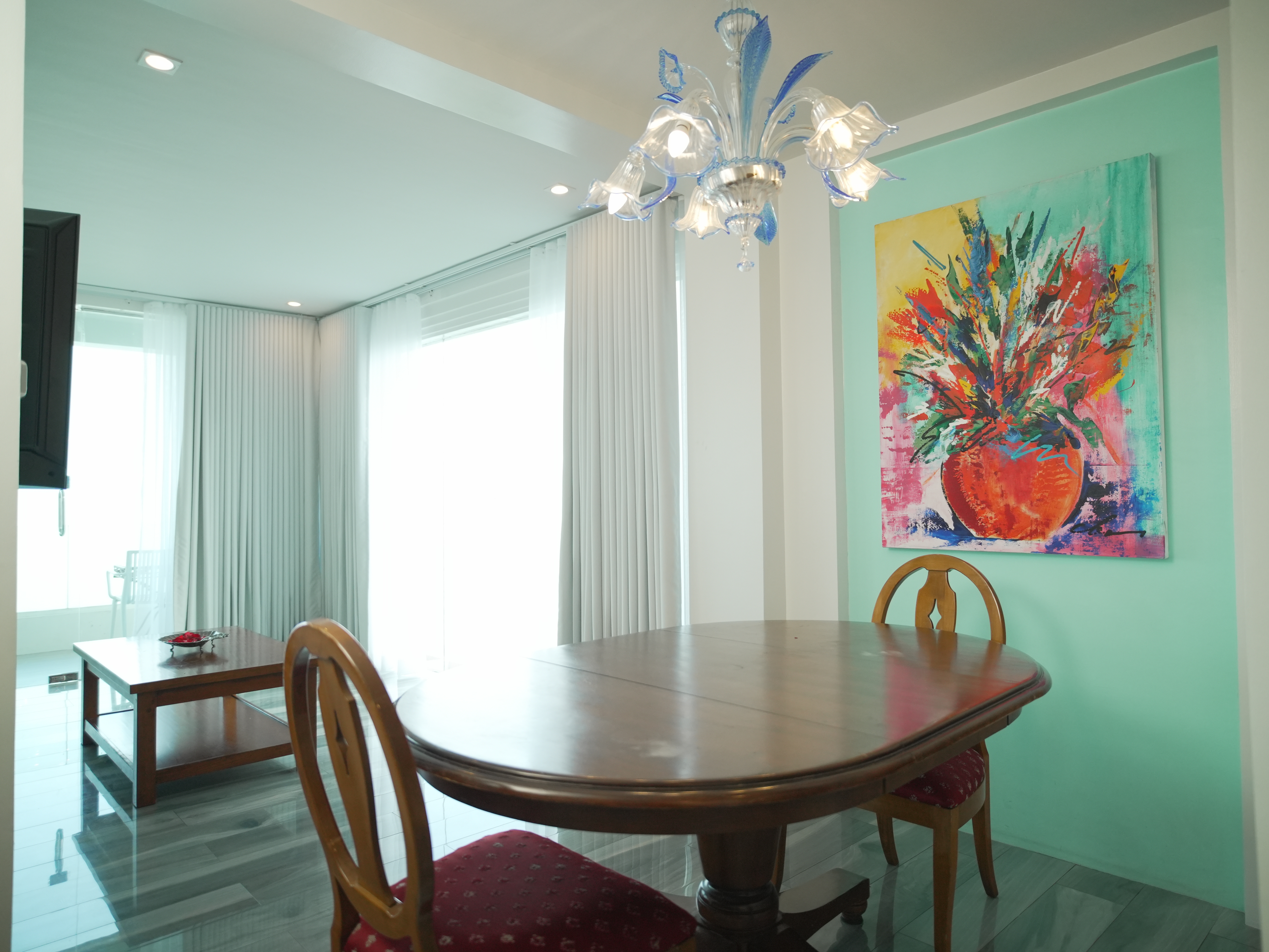 The Murano Suite is home to an assortment of fine Venetian glass lighting fixtures from chandeliers to scones to drop lights, all shipped by air from Murano. Like all our other rooms, The Murano Suite is a corner unit. It was designed to showcase the breathtaking lake view to the east (Lake Taal) and ocean views to the south (Balayan Bay and Batangas Bay).
