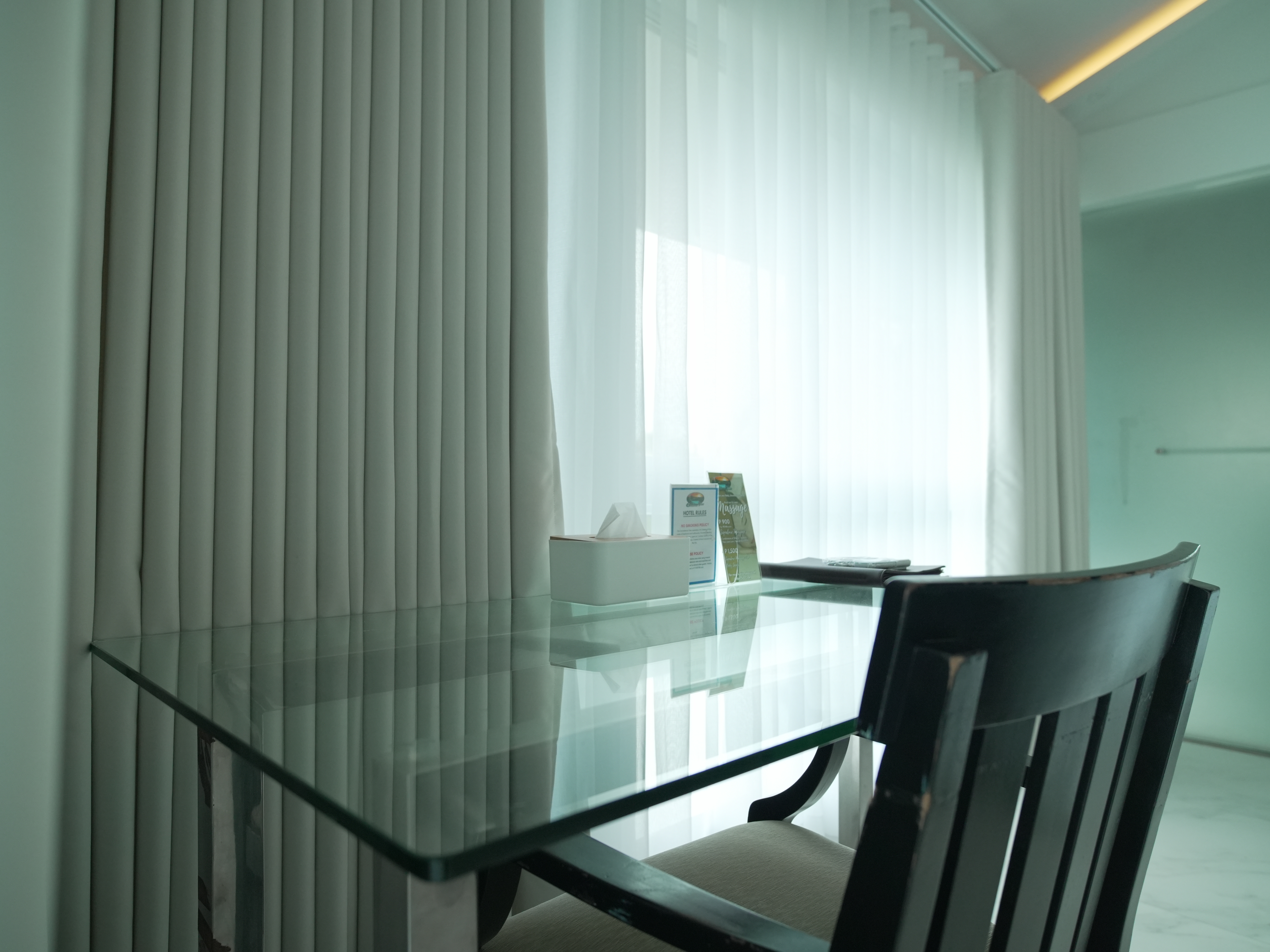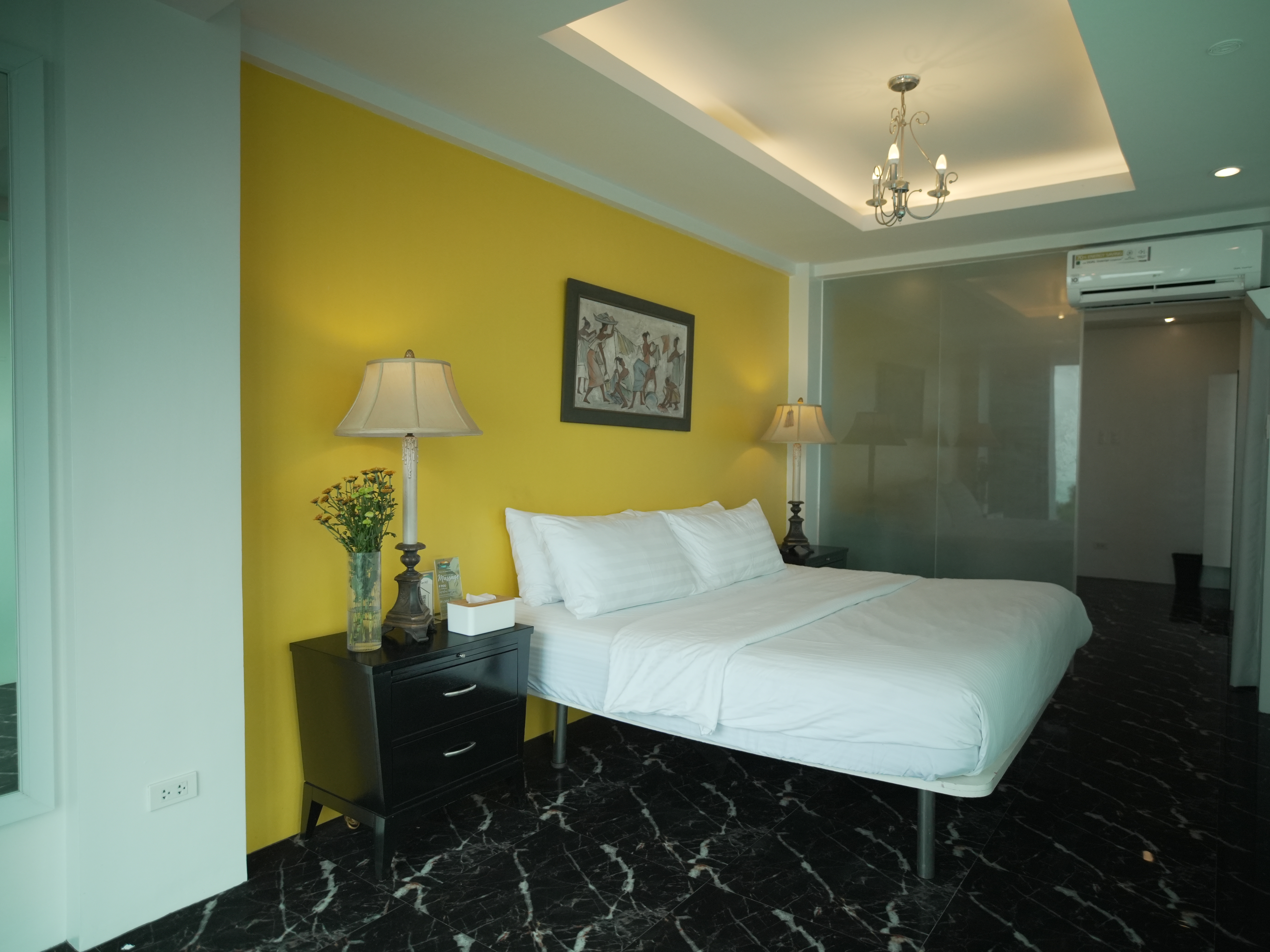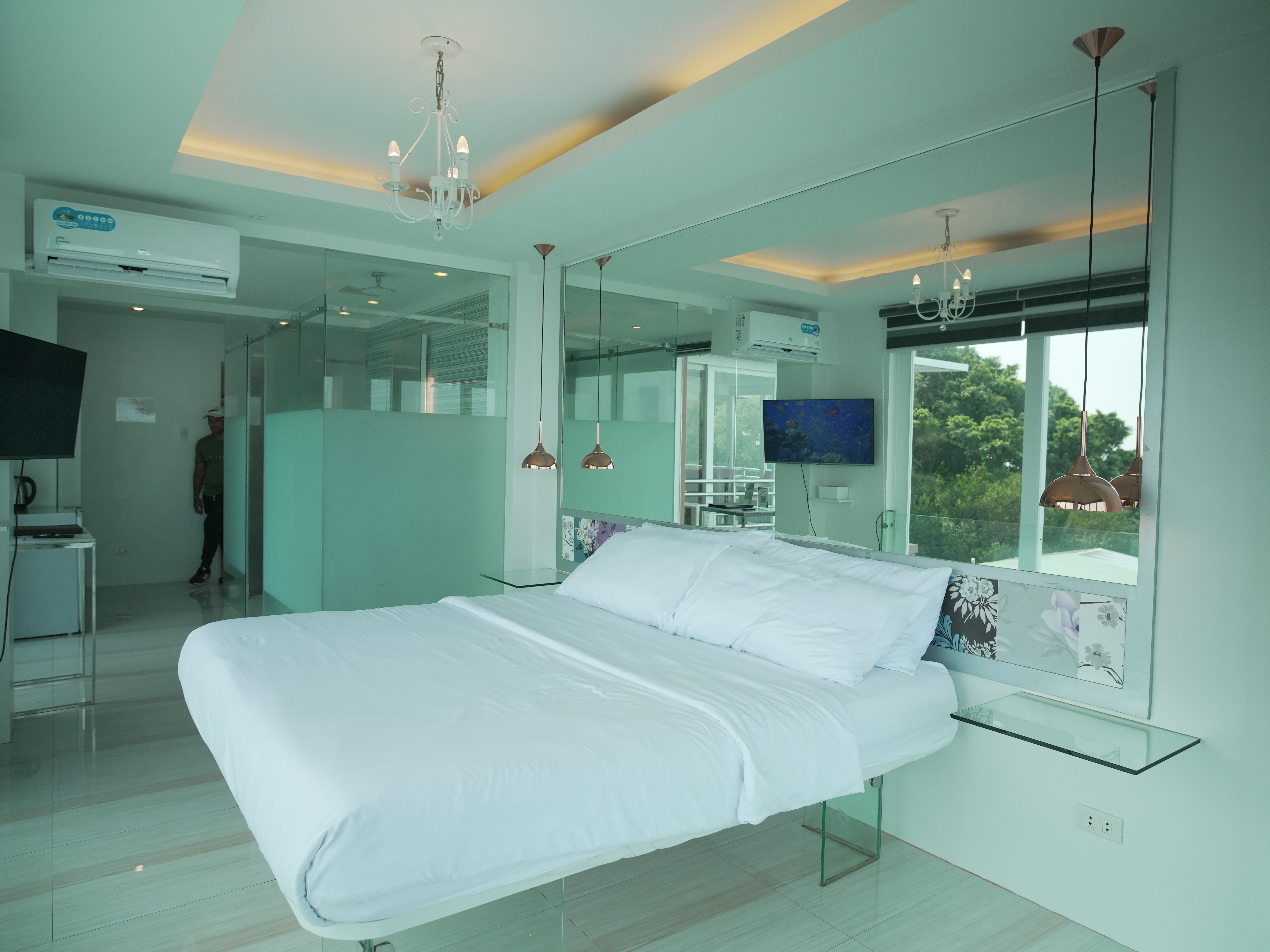 The room features floor to ceiling glass walls in an exceptionally spacious area (for a hotel room) of 65 square meters or 700 square feet. Its size necessitated the installation of three split type inverter air conditioning units with one unit dedicated to cooling and dehumidifying the bathroom. The contemporary design is given its character by a prudent combination of Italian and Spanish porcelain tiles juxtaposed with intricate Venetian glasswork lighting. The moveables were made by Ethan Allen for the precision pieces and by local craftsmen for the single piece hardwood pieces, while the suite's bathroom fixtures were made by the German company Grohe.