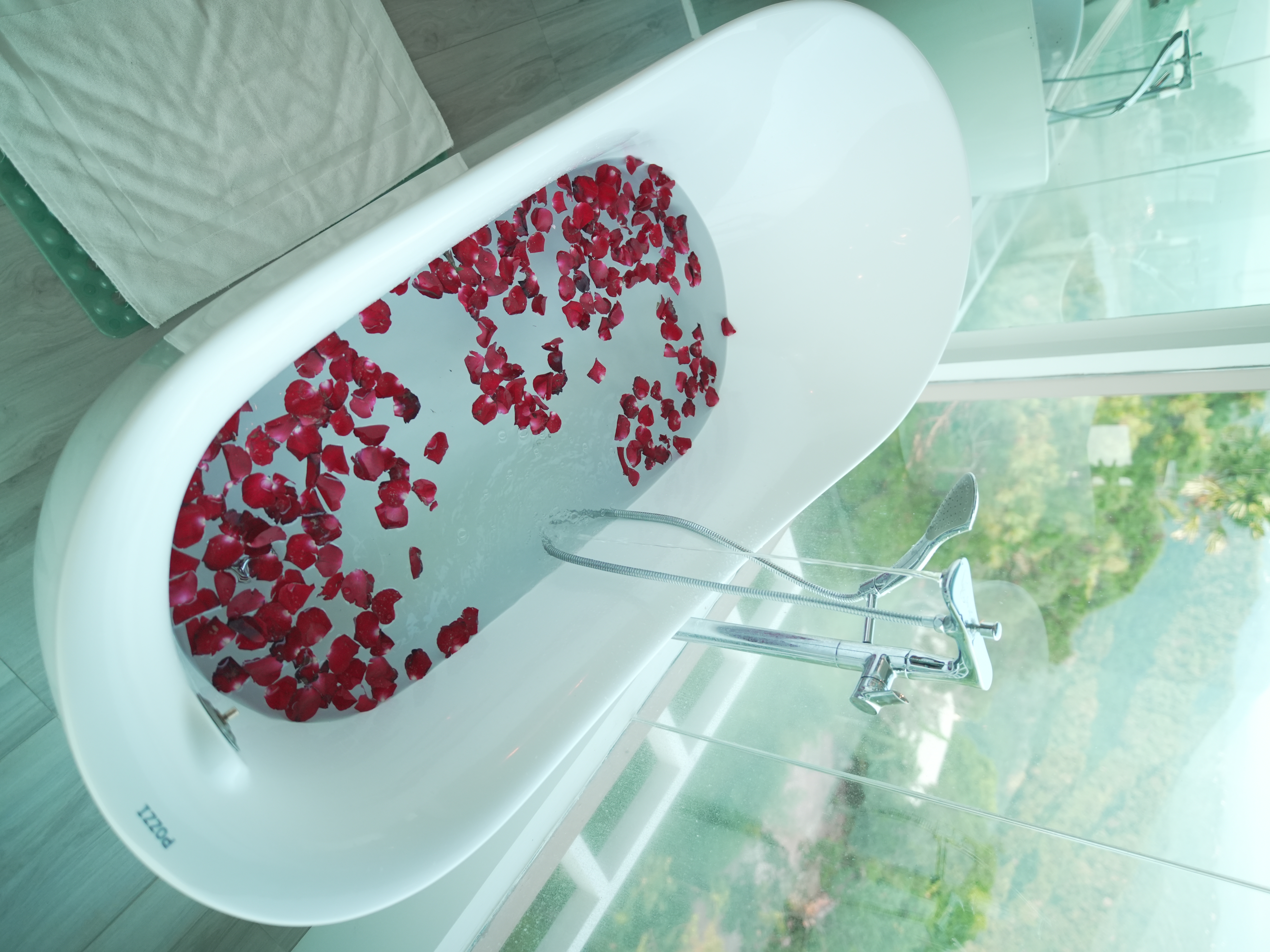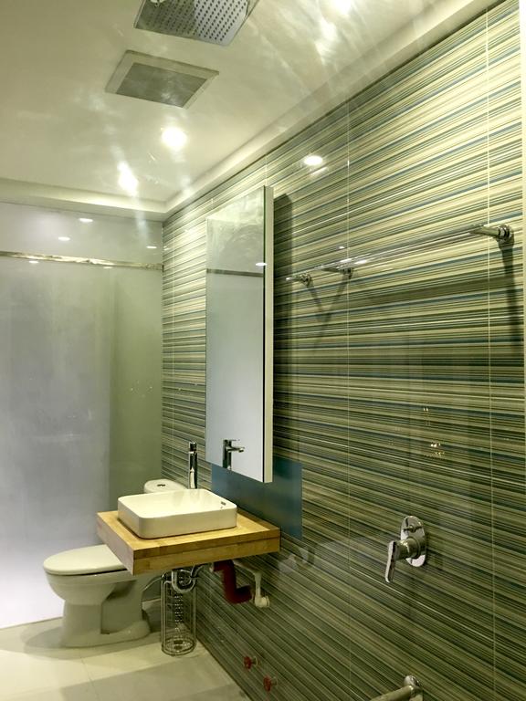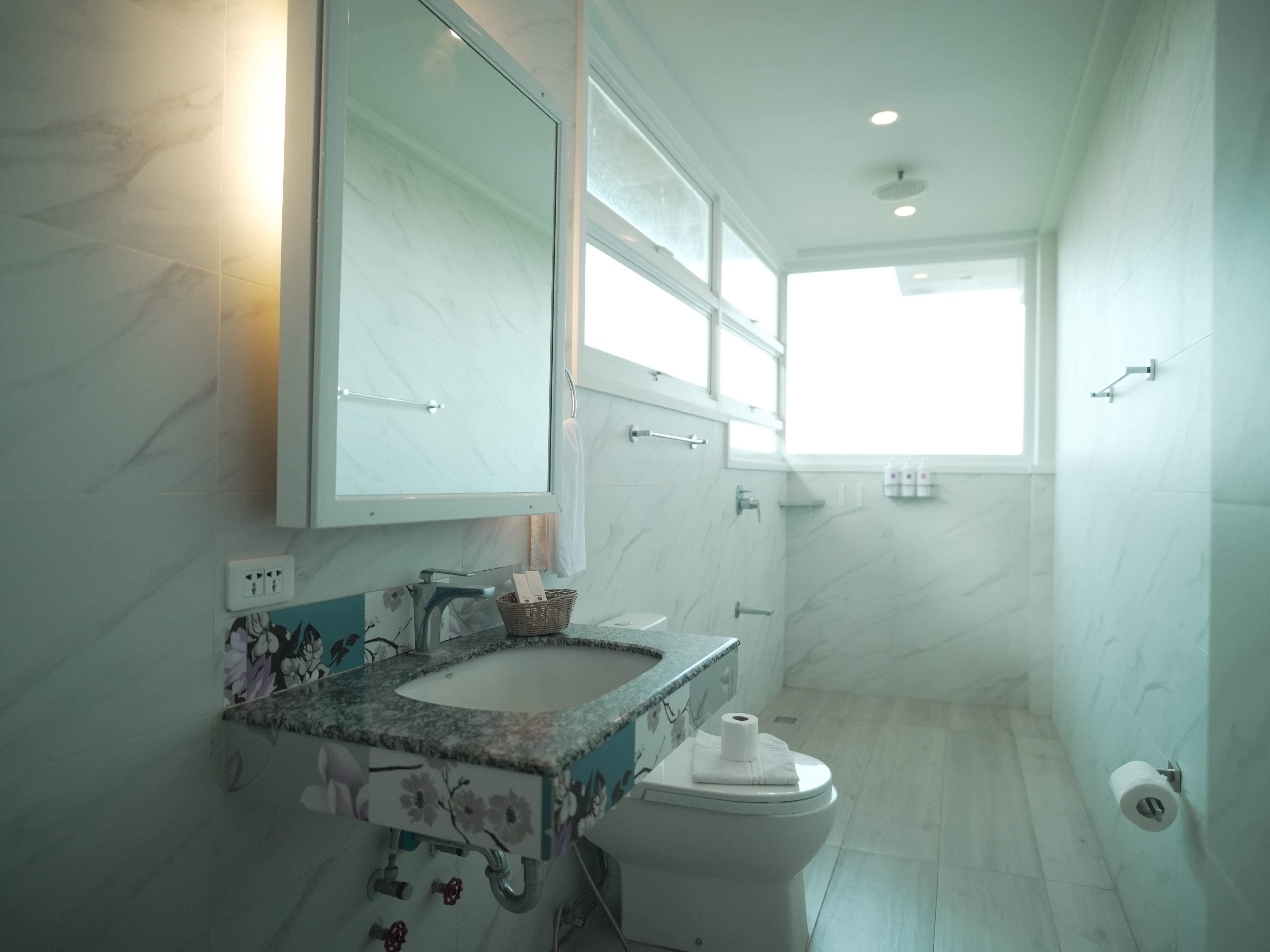 The room features floor to ceiling glass walls in an exceptionally spacious area (for a hotel room) of 65 square meters or 700 square feet. Its size necessitated the installation of three split type inverter air conditioning units with one unit dedicated to cooling and dehumidifying the bathroom. The contemporary design is given its character by a prudent combination of Italian and Spanish porcelain tiles juxtaposed with intricate Venetian glasswork lighting. The moveables were made by Ethan Allen for the precision pieces and by local craftsmen for the single piece hardwood pieces, while the suite's bathroom fixtures were made by the German company Grohe.