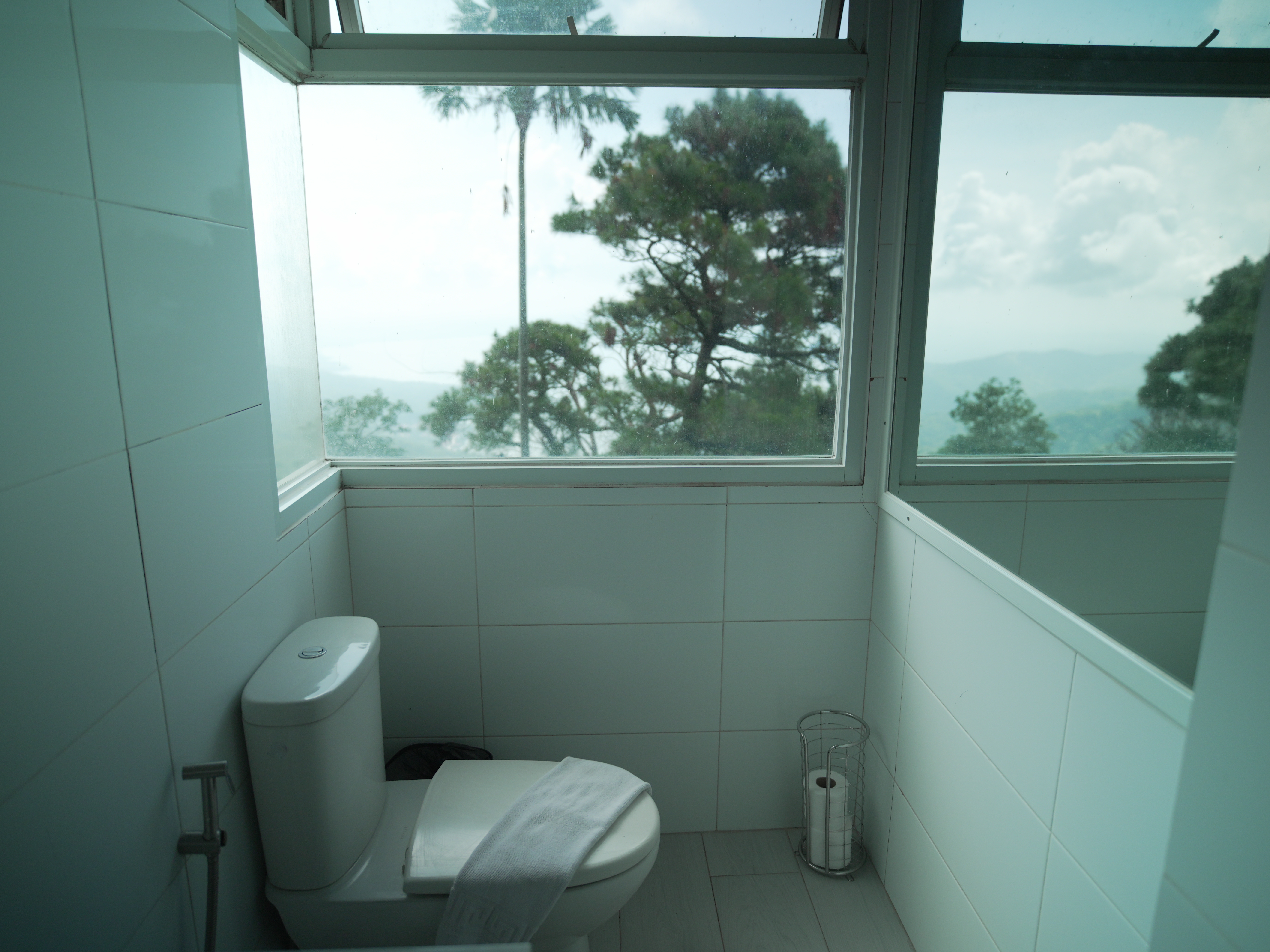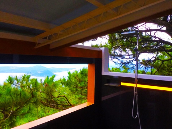 The Cabana is a full bathroom all to itself that is equipped with Grohe fittings, Baldwin Brass lighting and a bathtub. Its roof is designed to cover only half of the Cabana so that the lavatory and the toilet are indoors and the bathtub and rain shower are semi-outdoors whose only roofing are the branches and needles of a big pine tree. On a clear day, the Cabana offers breathtaking views of Taal Lake and the majestic mountains of Makiling, Maculod and Banahaw. On a clear night, while immersed in the relaxing bathtub, the occupants will be able to see the stars and the rest of the night sky through the delicate branches and needles of the pine tree. The entire structure is cleverly designed such that it can give the feel of being outdoors amid trees while assuring the privacy of its occupants.